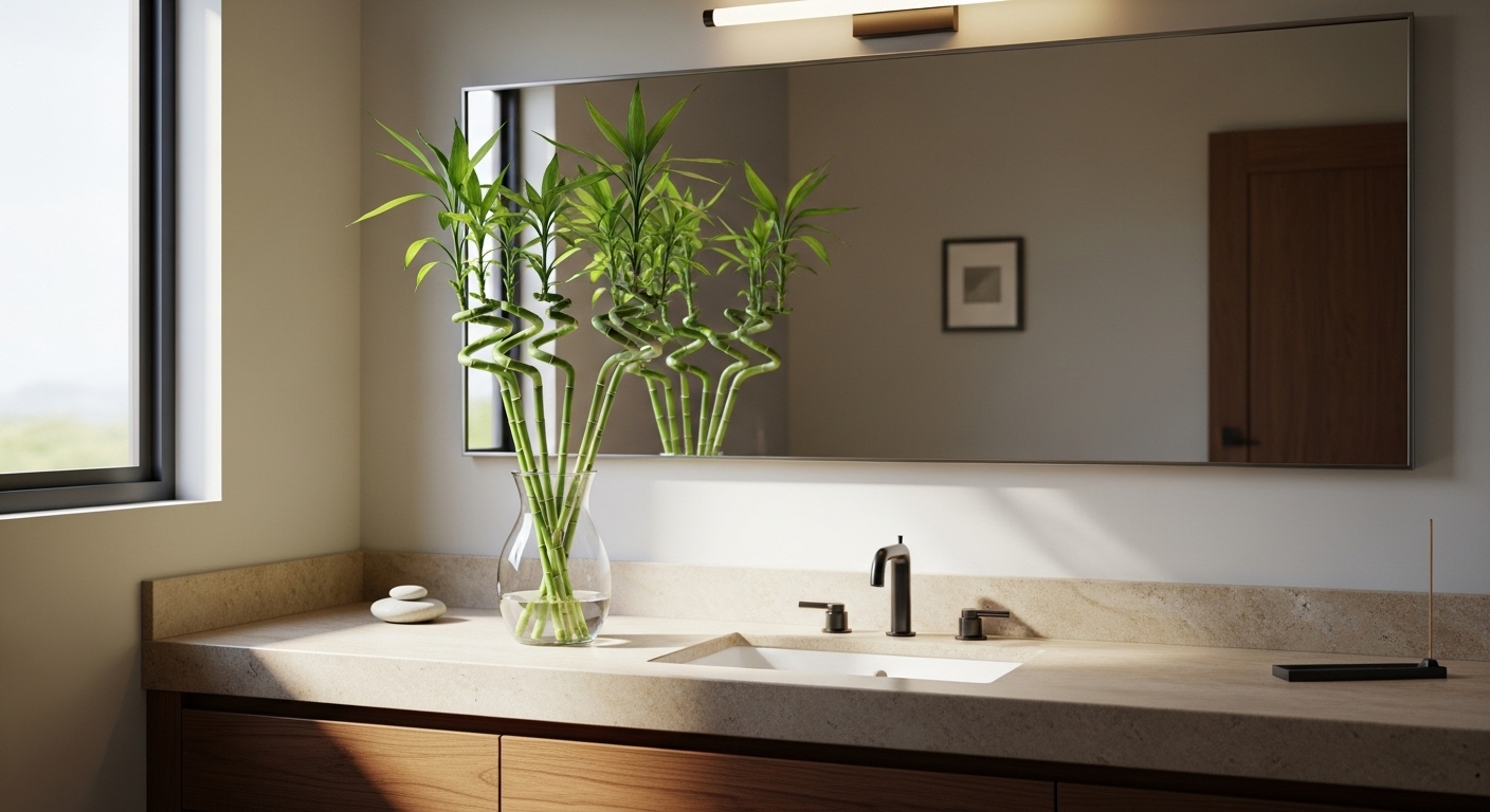 Lucky bamboo is a striking and symbolic choice that thrives in bathrooms. It can grow in water alone, making it an excellent fit for sink counters or vanity tops. Its smooth green stalks and spiraling stems lend a Zen-inspired look that pairs beautifully with stone or wood finishes.
