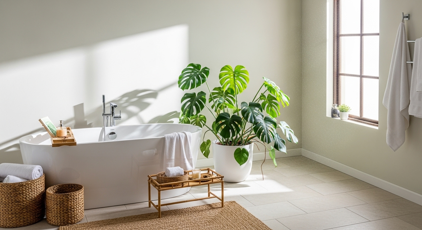 No plant says “tropical luxury” quite like a Monstera. Its dramatic, perforated leaves make it a sculptural centerpiece for larger bathrooms. Monstera thrives in moderate light and high humidity, which makes it nearly perfect for this setting.