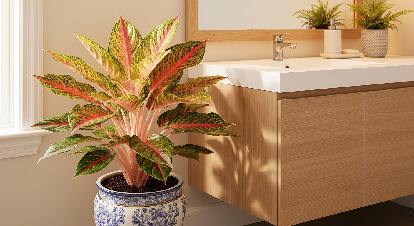 The Chinese evergreen is a fantastic option for bathrooms with medium to low light. Known for its broad, glossy leaves that range from green to silver and even pink varieties, it’s one of the easiest houseplants to grow indoors.