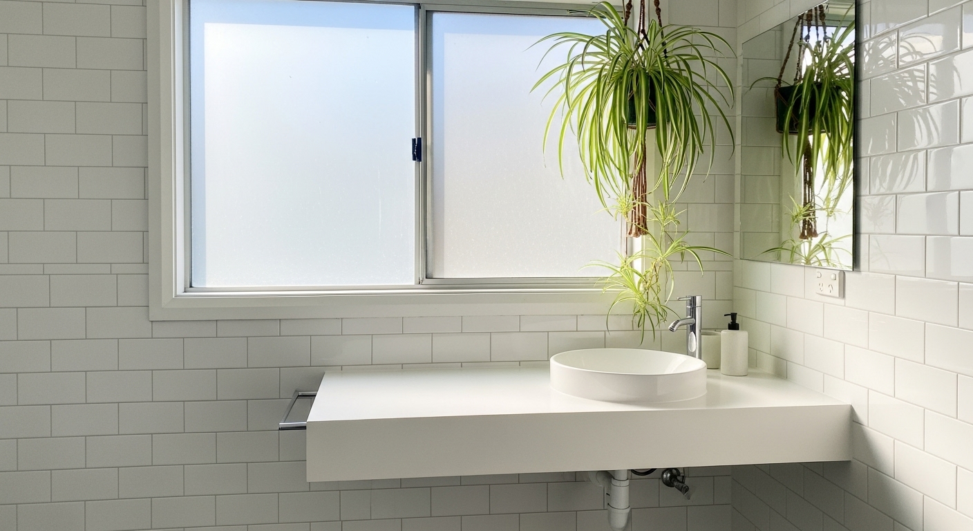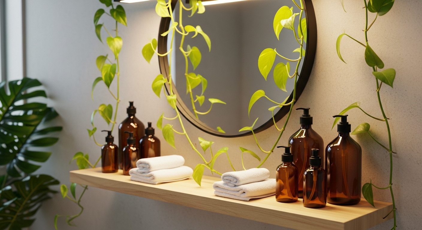 Pothos is one of the easiest plants to grow, even in low-light bathrooms. Its trailing vines create a lush, cascading effect that softens sharp corners or shelves.