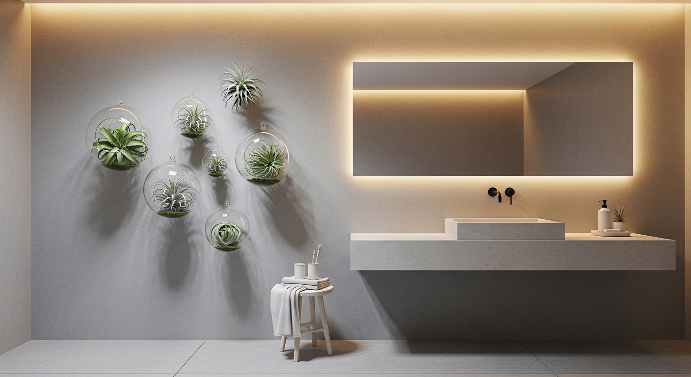 Air plants are among the most versatile options for bathroom styling. They don’t need soil—just occasional misting and good airflow. Their sculptural shapes can be displayed in glass terrariums, mounted on driftwood, or suspended in hanging holders.