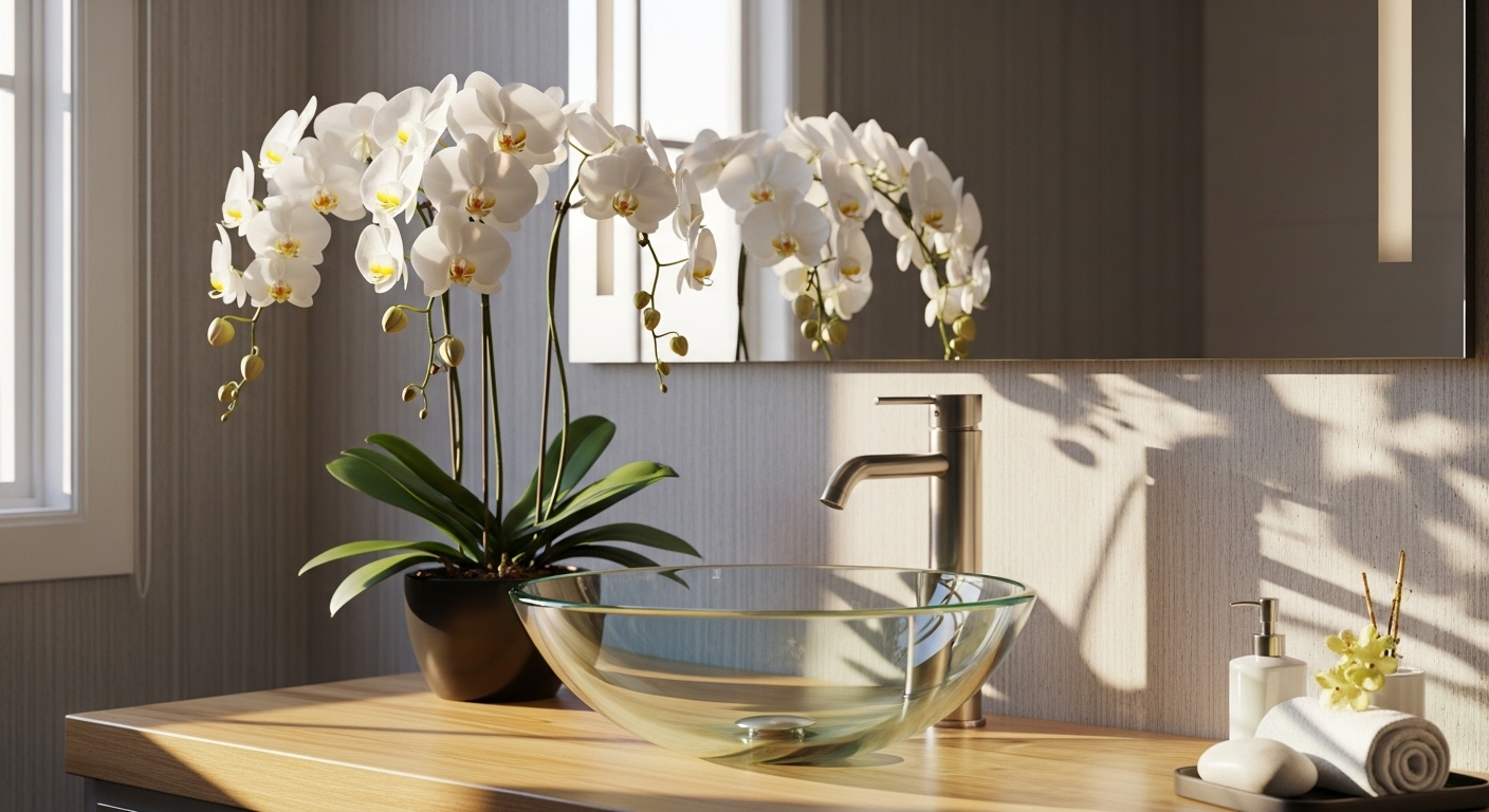 Orchids instantly elevate a bathroom with their refined, exotic presence. They flourish in the warm humidity produced by showers, making them surprisingly easy to maintain in bathrooms.