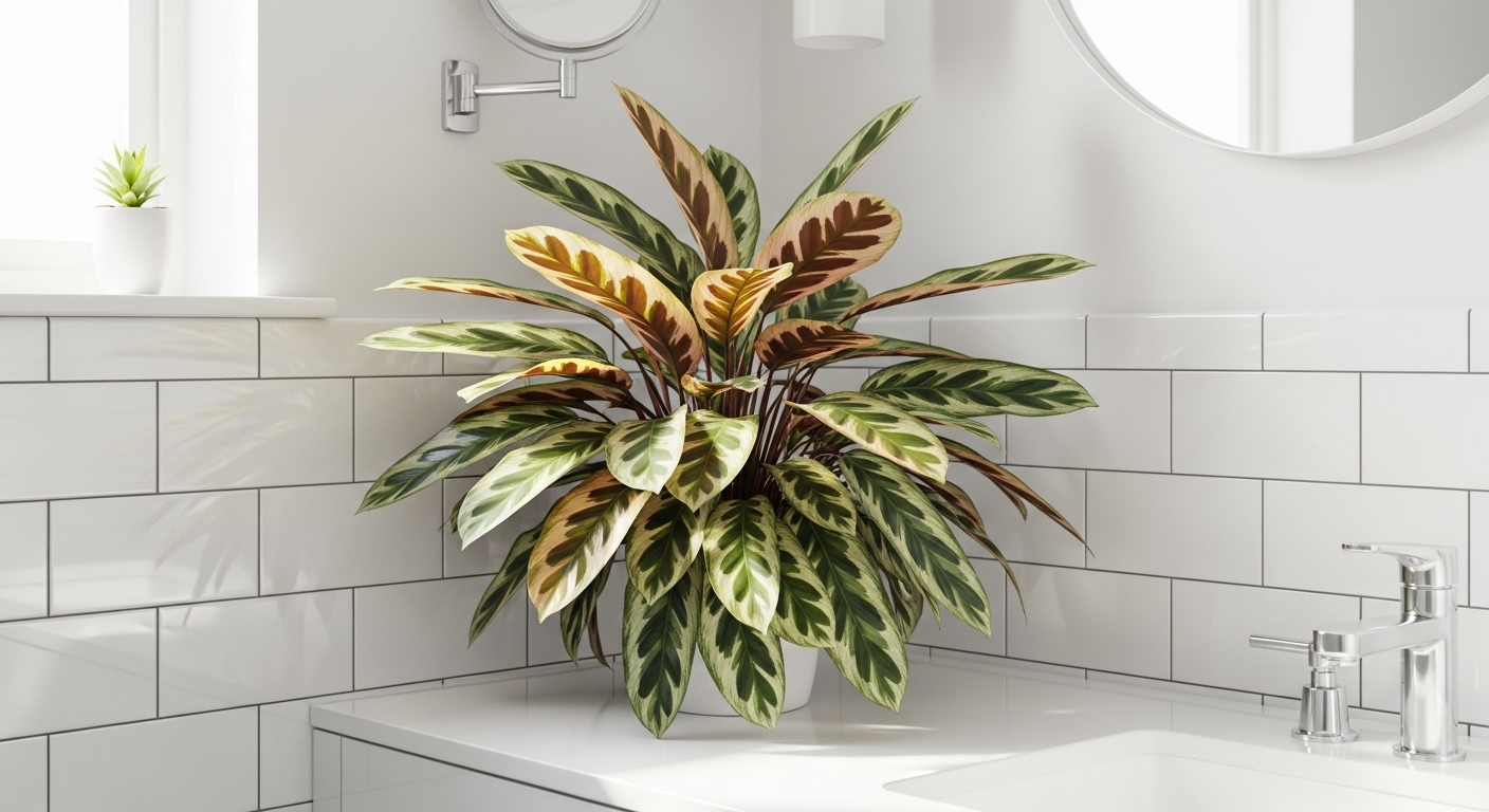 Calathea, often called the “prayer plant,” is famous for its striking leaf patterns and its unique trait of folding its leaves at night. It prefers high humidity, making the bathroom its ideal habitat.