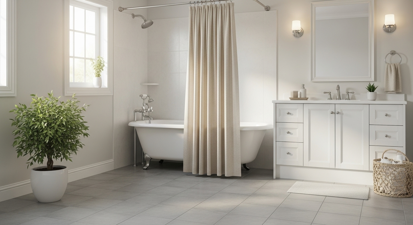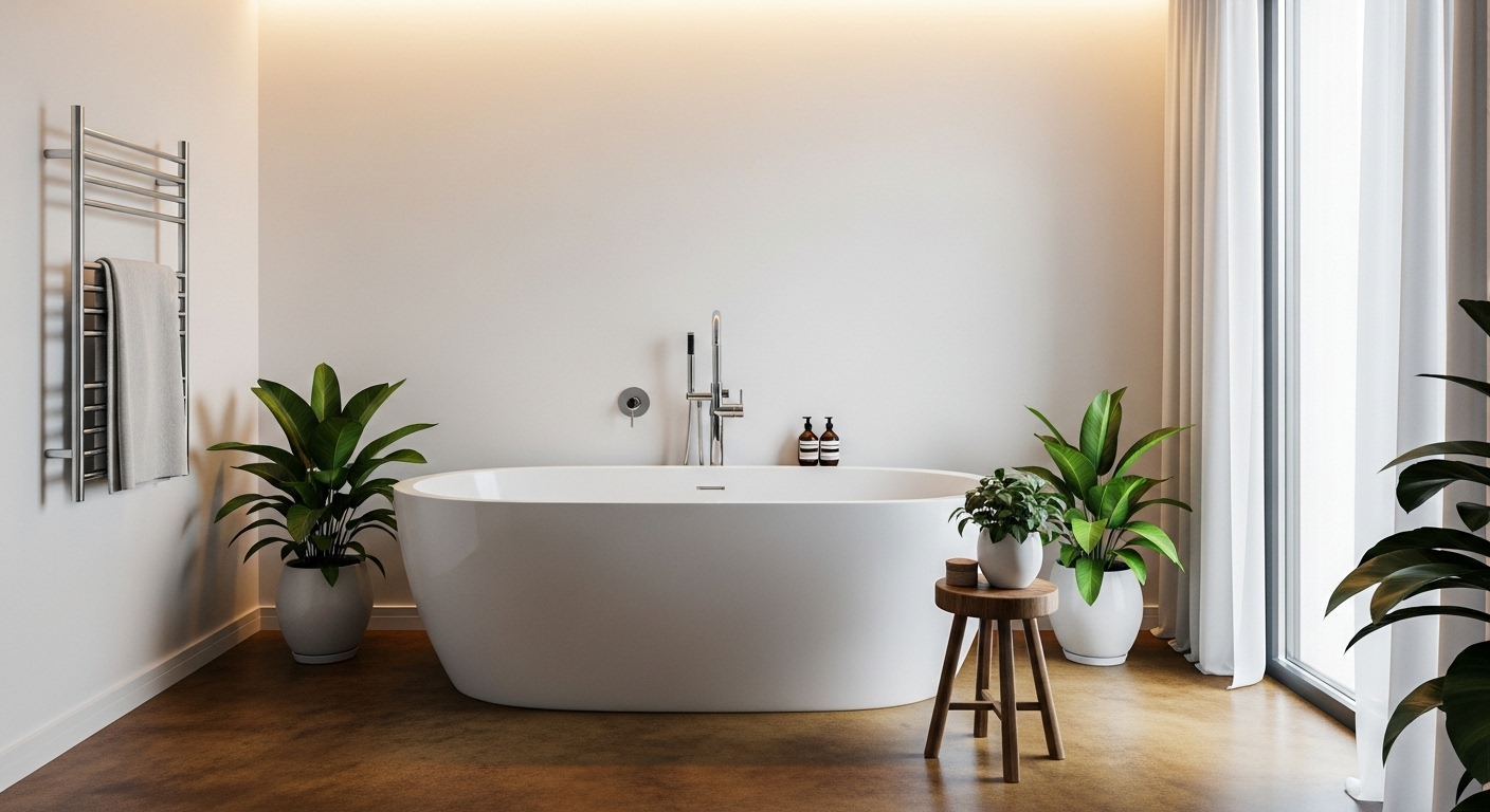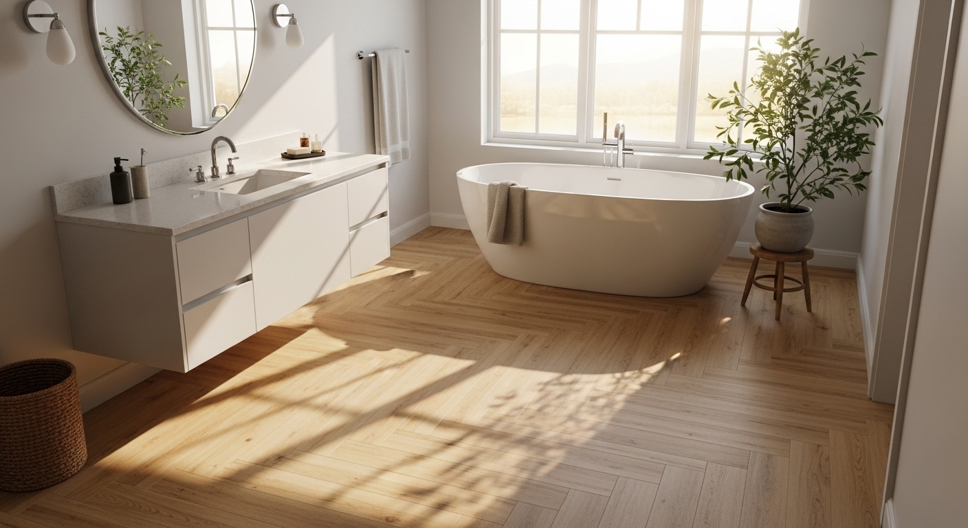 Pro Tip: Install it in a diagonal or herringbone pattern for extra visual dimension. Adding a soft, neutral rug near the tub instantly elevates the space.
