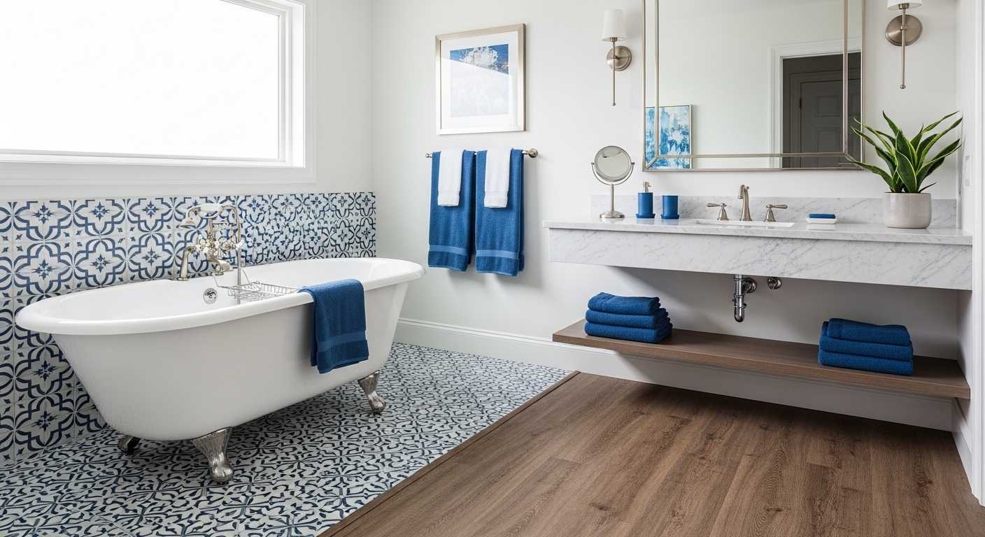 Mixing materials—like vinyl planks with patterned tiles—can deliver high-end design impact at a low cost. Use wood-look vinyl around the vanity for warmth, and statement tile near the tub or shower for easy cleaning and visual contrast.