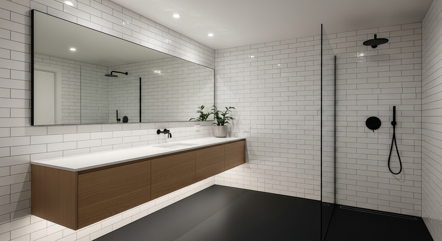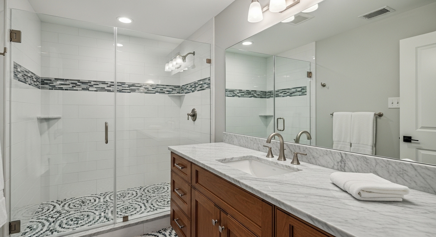Transitions can be defined with metal edging or grout color changes, creating zones within the bathroom while maintaining cohesion.