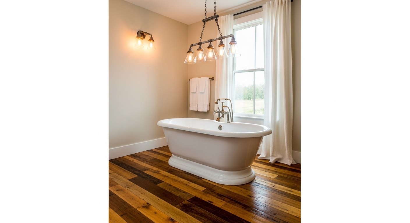 If you’re drawn to rustic or vintage design, reclaimed wood flooring brings authentic charm and eco-conscious appeal. While real wood isn’t typically bathroom-safe, properly sealed reclaimed planks can withstand moderate humidity.