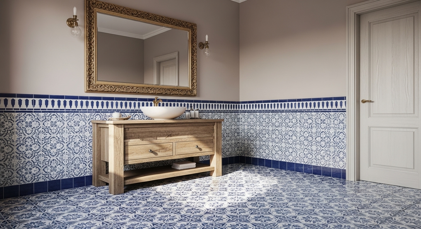 Patterns inspired by Mediterranean or Moroccan styles can instantly elevate a simple bathroom. Finish with a clear waterproof sealer to protect against moisture.