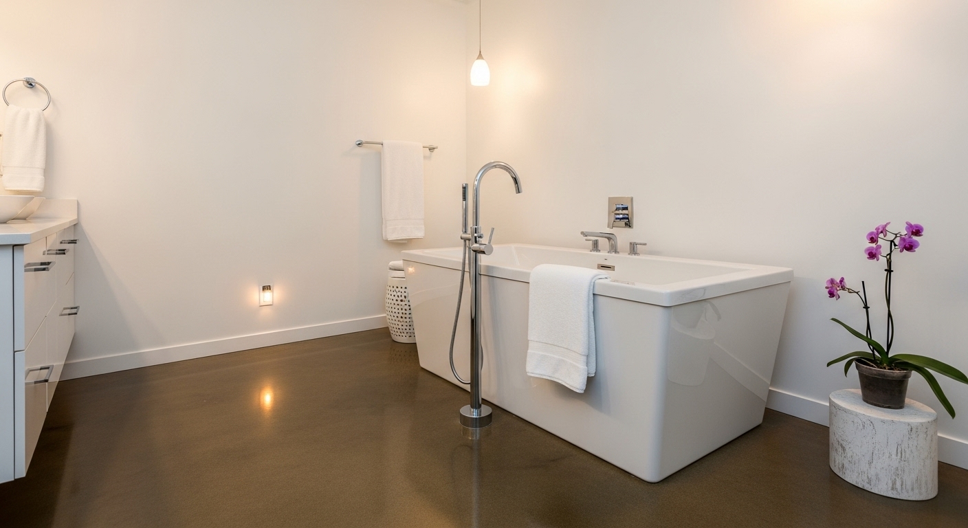 If your bathroom has a concrete subfloor, turn it into a design feature. With a few coats of concrete paint or epoxy, you can achieve a sleek industrial aesthetic that’s waterproof, durable, and modern.
