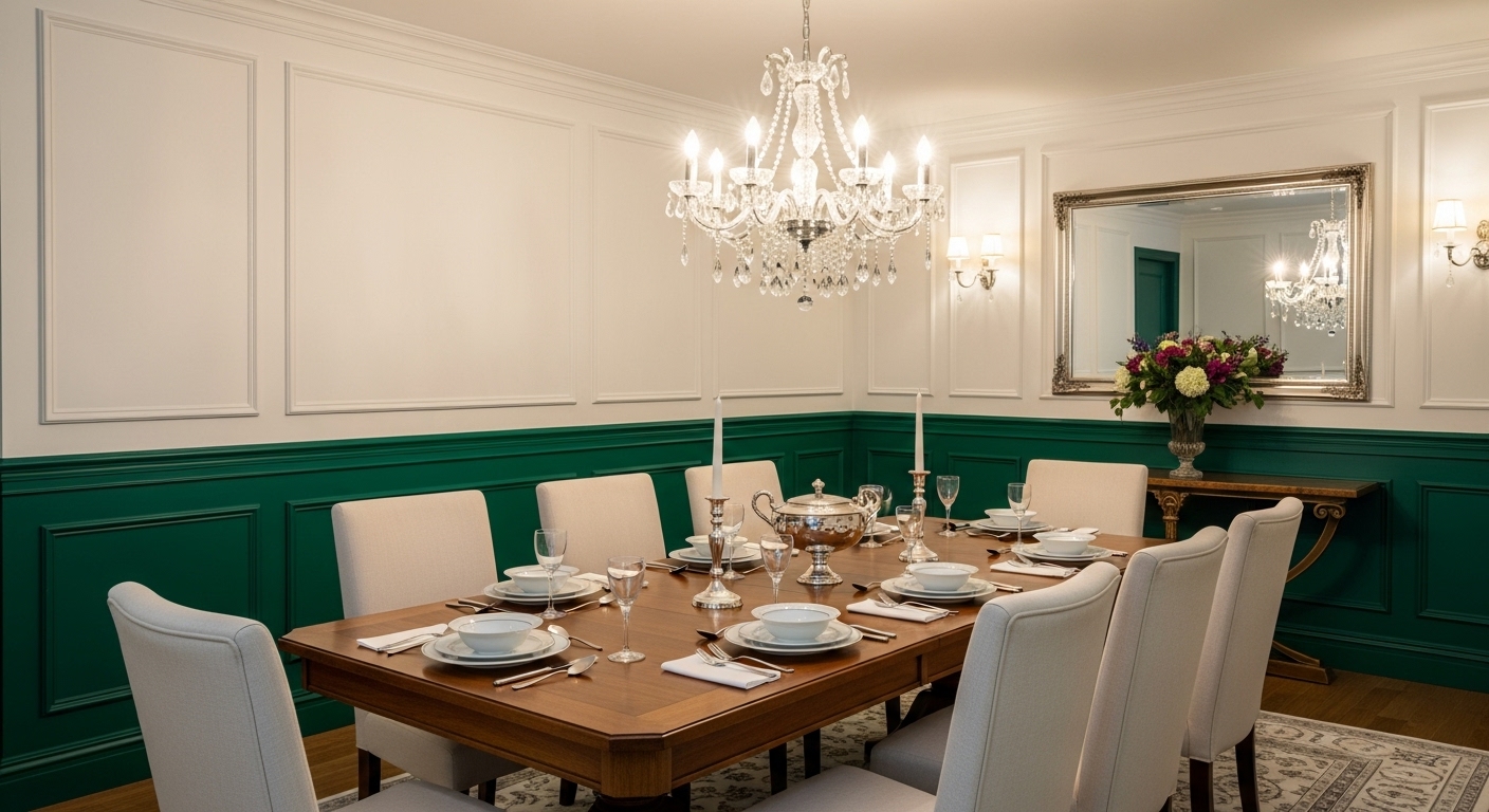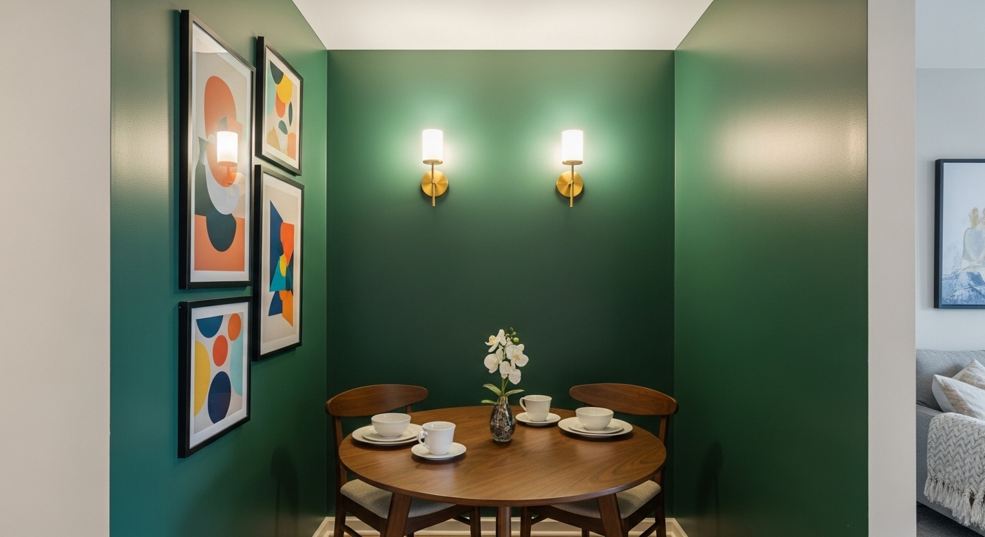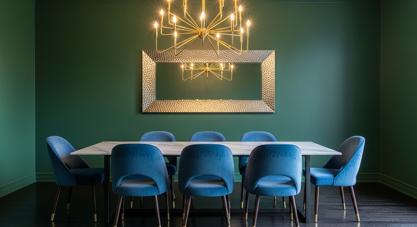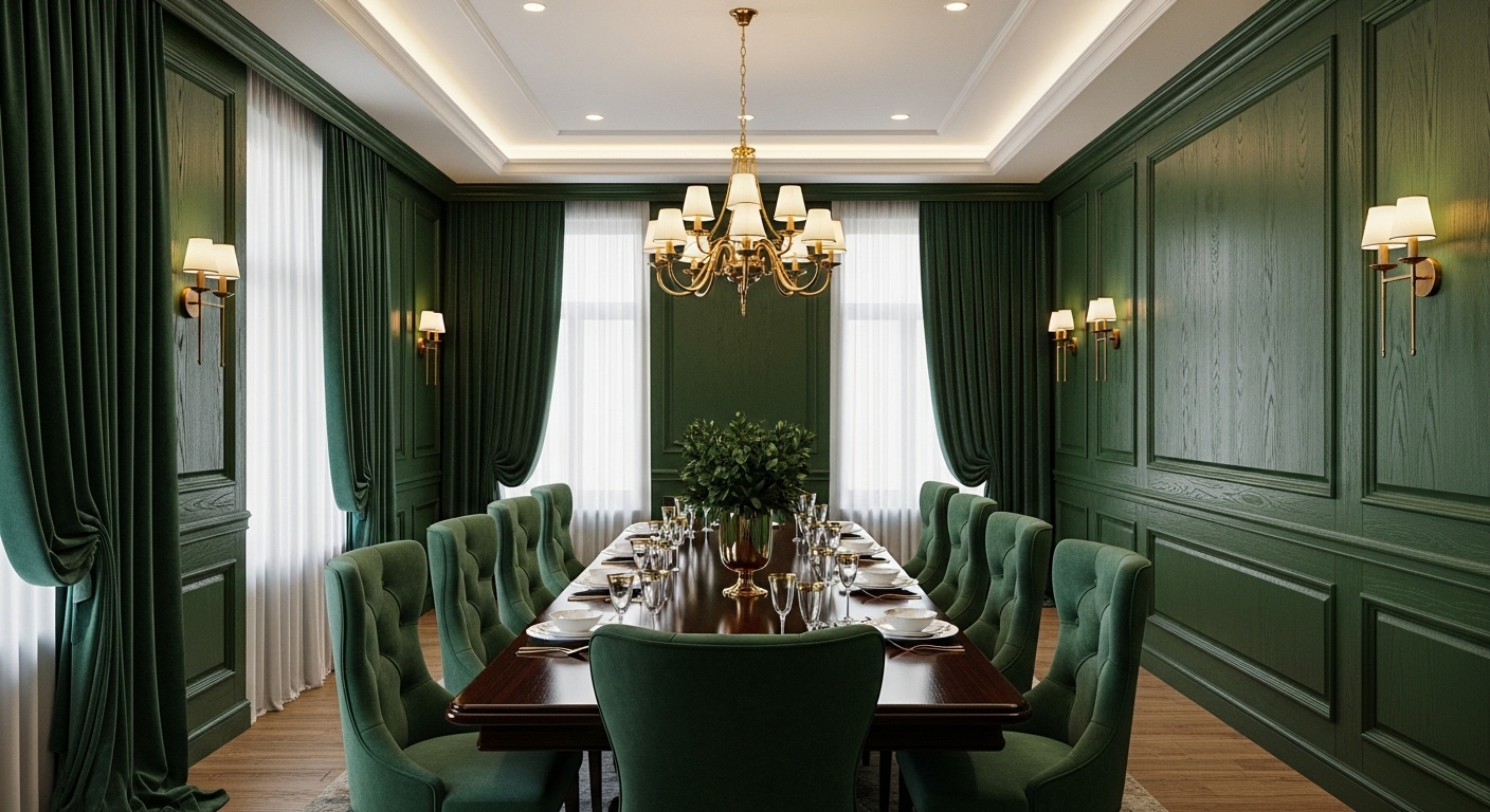An emerald green accent wall sets the tone for refinement. When you introduce this rich hue as a feature wall, it immediately anchors the space. It can highlight architectural details like moldings or serve as a perfect backdrop for your dining table.