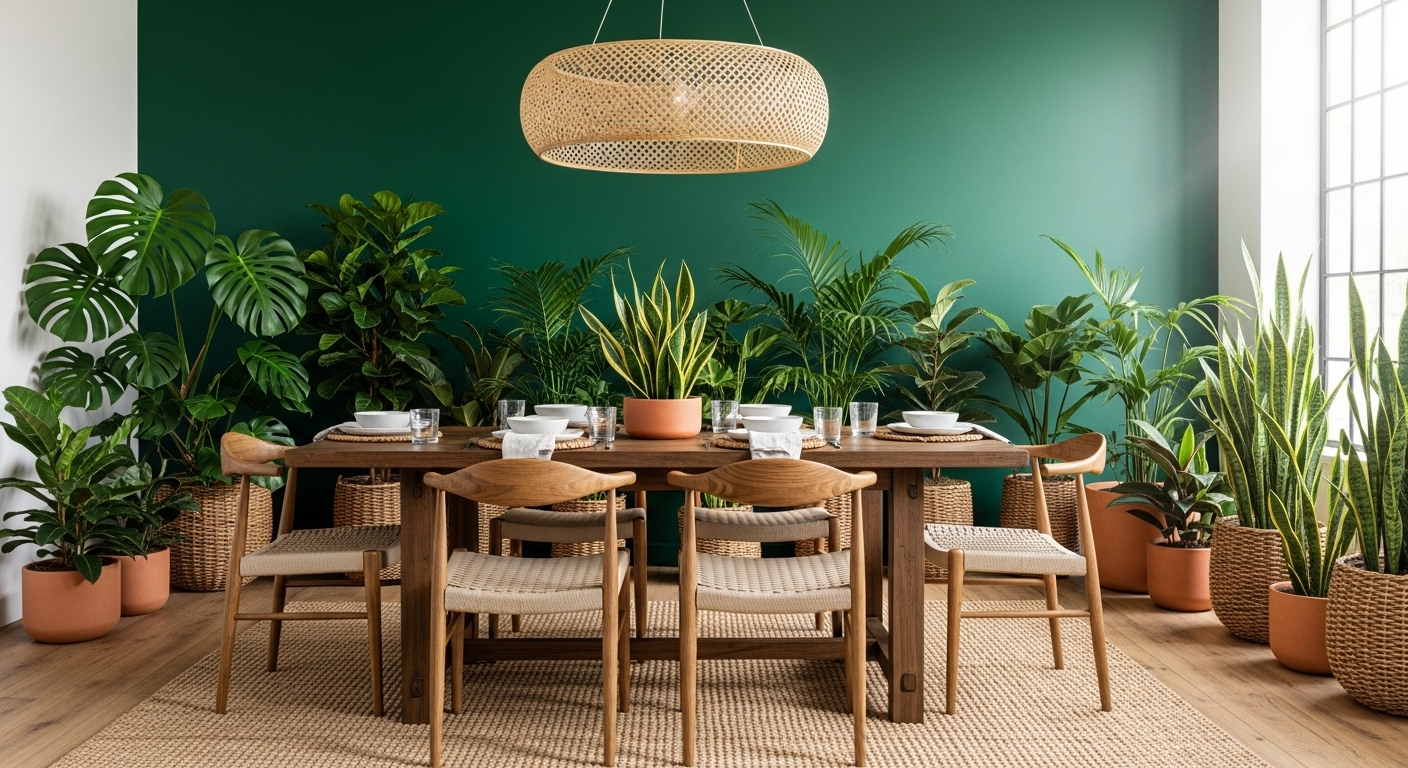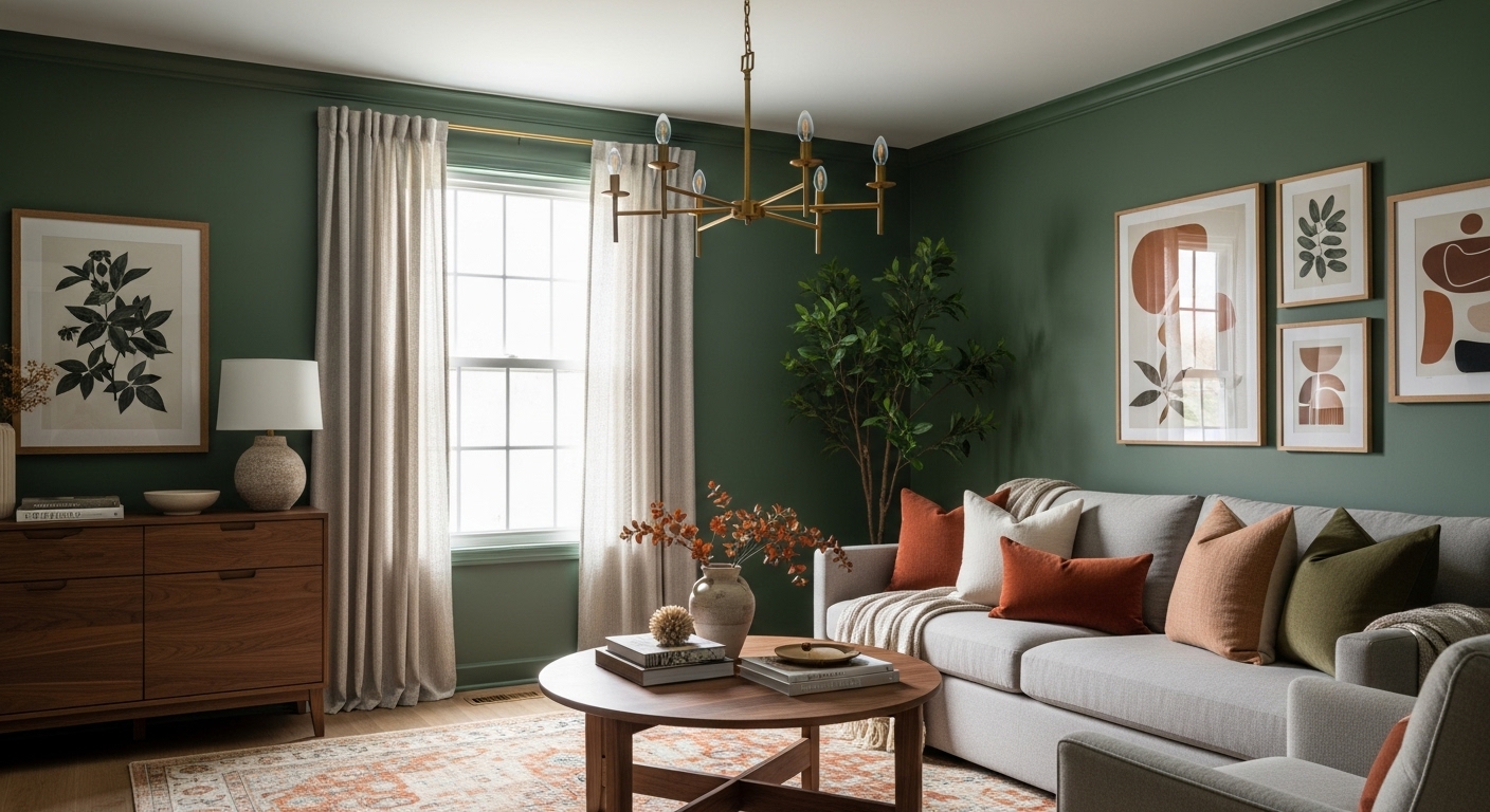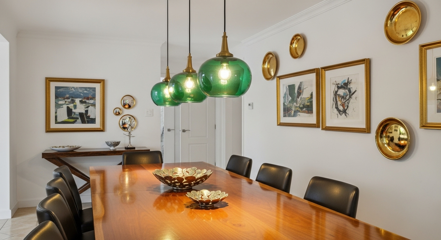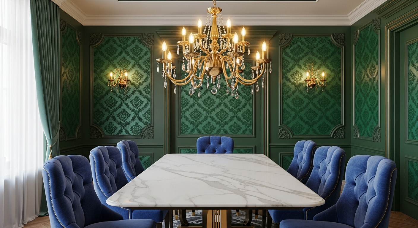 An emerald green accent wall sets the tone for refinement. When you introduce this rich hue as a feature wall, it immediately anchors the space. It can highlight architectural details like moldings or serve as a perfect backdrop for your dining table.