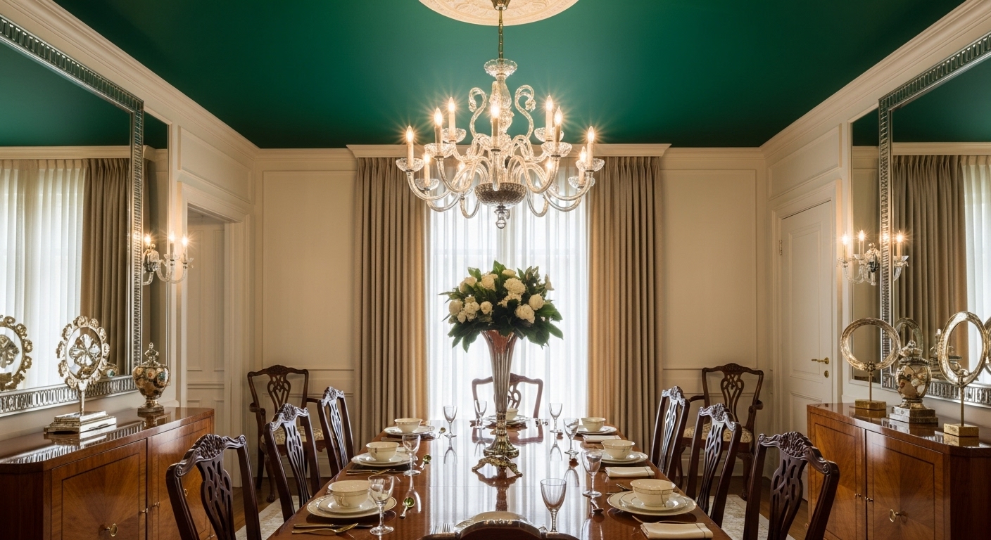 Ceilings are often forgotten design elements, but painting yours emerald green instantly adds depth and intimacy. This inverted approach creates a canopy effect—dramatic yet refined.