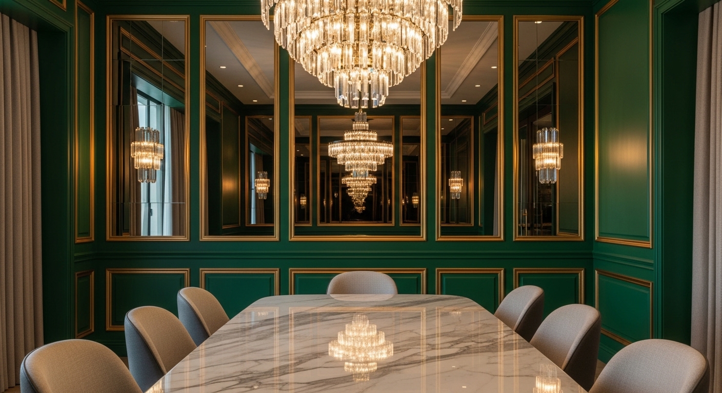 Mirrored sections also double the impact of chandeliers or candlelight—perfect for evening dining.