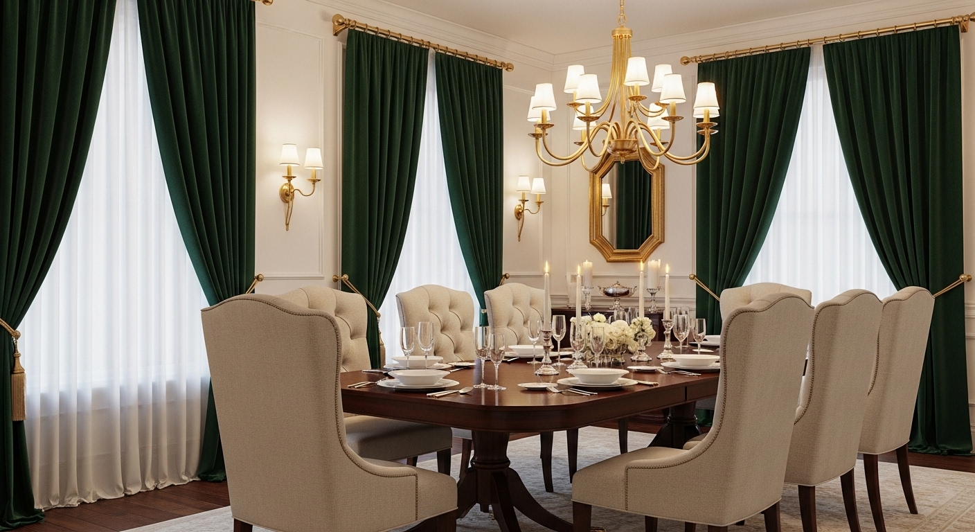 Emerald green curtains instantly elevate your dining space. Their flowing texture frames windows and softens bold wall colors. Velvet or heavy linen curtains paired with gold rods create an inviting yet regal effect.