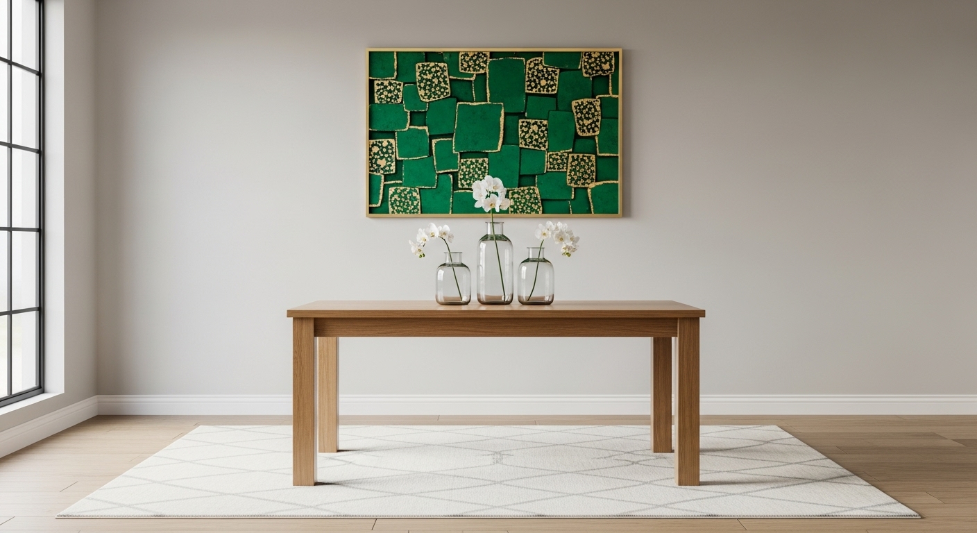 Not every dining room needs bold paint. You can layer emerald tones through framed art, sculptures, or table accessories. A rug with green accents, napkins, or a glass vase can tie your palette together subtly yet effectively.