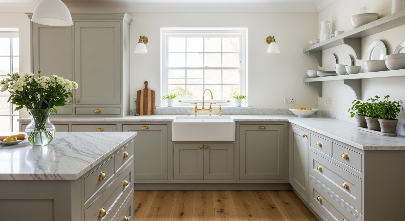 Shaker cabinets are the farmhouse staple. Defined by their clean lines and recessed panels, they bring timeless simplicity and quiet elegance to any kitchen. Imagine creamy-white cabinets that glow softly in the morning light, paired with brushed-brass handles and warm oak countertops. The balanced proportions of Shaker doors bring visual calm, making the kitchen feel organized and harmonious.