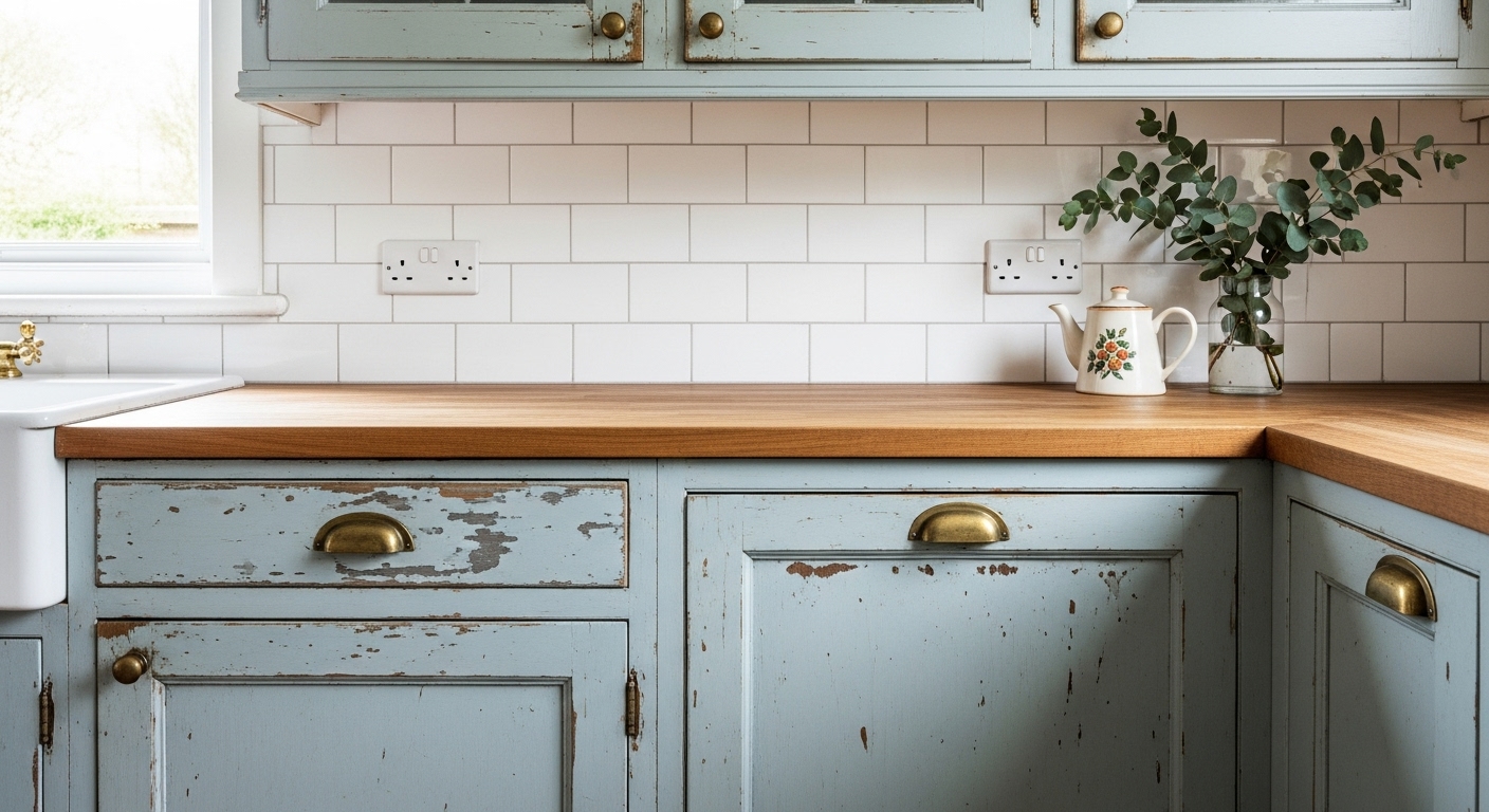 Distressed or chalk-painted cabinets evoke the charm of vintage furniture—soft edges, hand-rubbed paint, and a sense of time well spent. Imagine cabinets in faded gray-blue with brushed edges revealing warm undertones beneath. They instantly soften the space and tell a story of age and love.