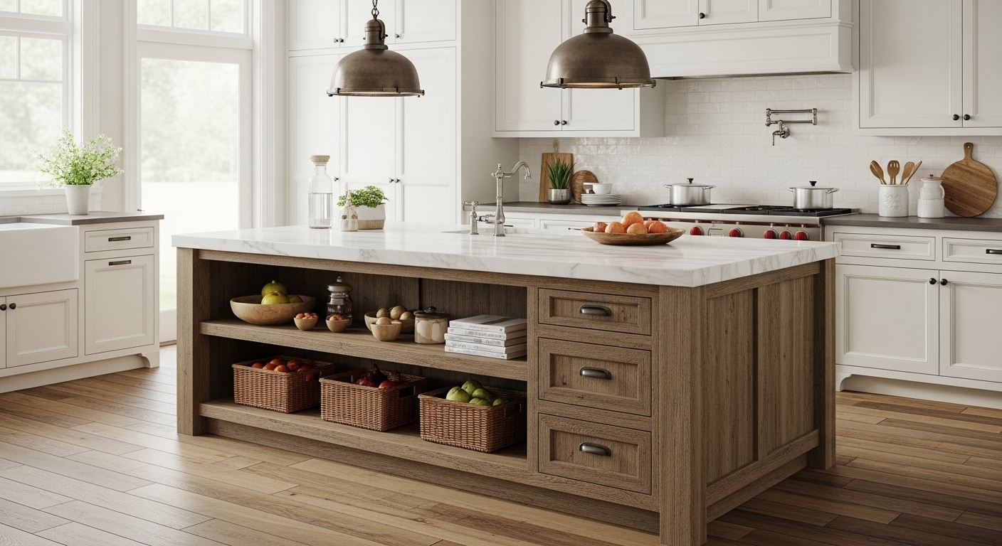 A freestanding farmhouse island feels like a beloved heirloom. Whether crafted from reclaimed pine or painted in a soft hue, it becomes the kitchen’s centerpiece. Imagine a weathered wood island topped with marble, open shelves filled with baskets, and stools tucked beneath. It invites conversation as much as it provides workspace.