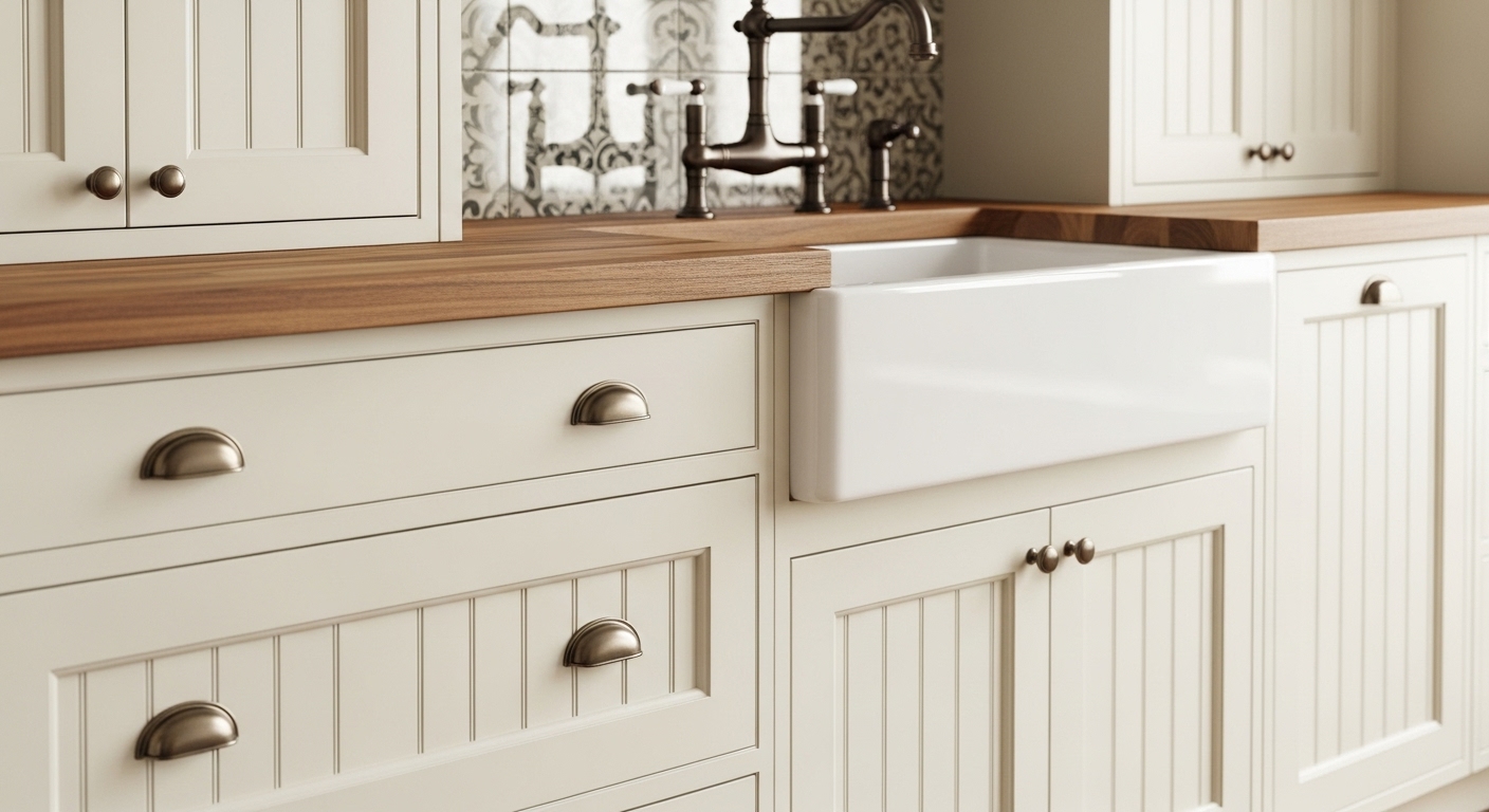 Beadboard cabinets add vertical rhythm and cozy texture. They nod to early farmhouse pantries and bring movement to plain surfaces. Visualize cream cabinets with narrow beadboard grooves, paired with bronze handles and warm light. The effect is tactile and timeless.