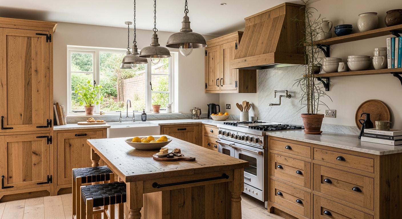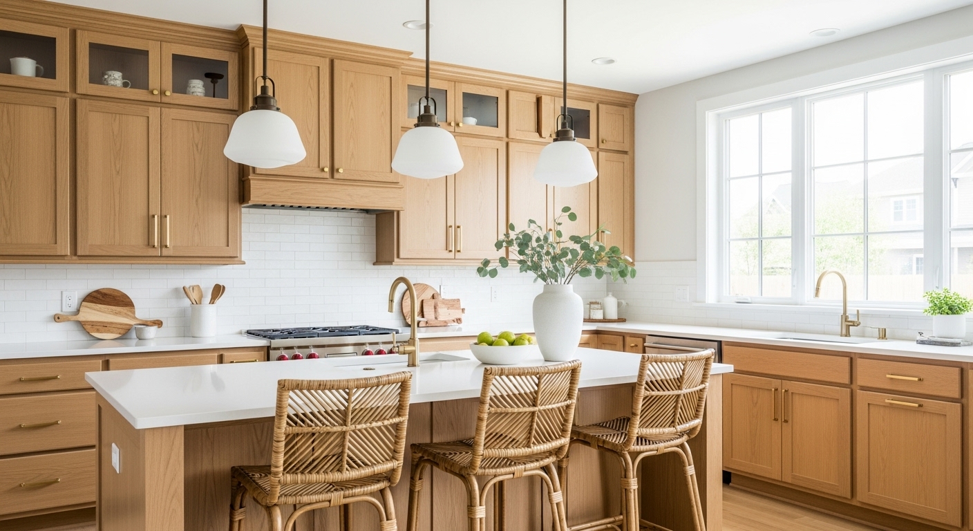 Natural oak has made a beautiful comeback in modern farmhouse kitchens. Its honey tones and subtle grain patterns bring softness and glow. Picture flat-panel oak cabinets with matte finishes, paired with sleek quartz countertops and brushed-gold handles. The warmth of the wood balances cooler metals and stones, creating a harmonious blend.
