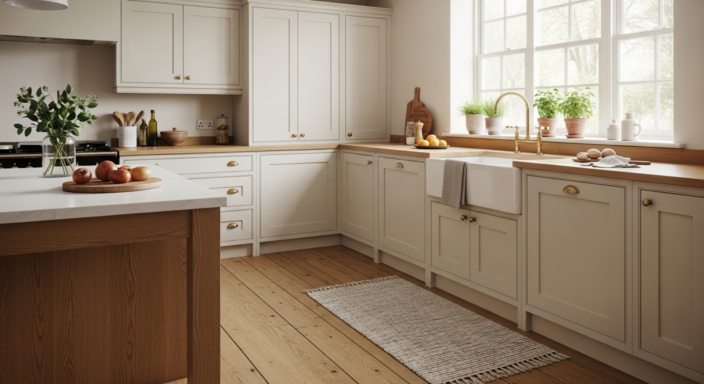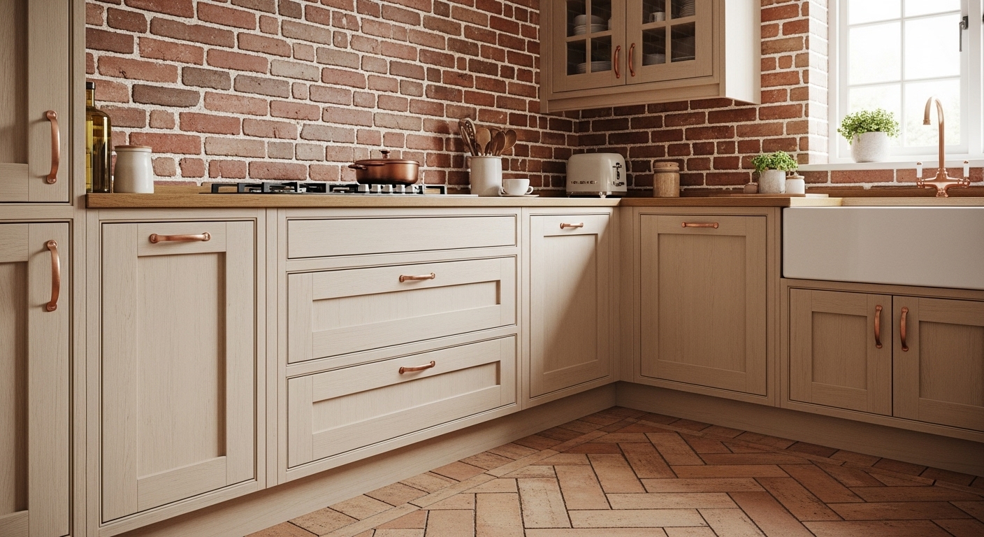 Buttermilk tones are the secret to capturing that golden farmhouse warmth. Unlike stark white, they glow softly under any light. Picture creamy cabinets against a backdrop of brick or terracotta tile, the gentle warmth creating a sunlit serenity.