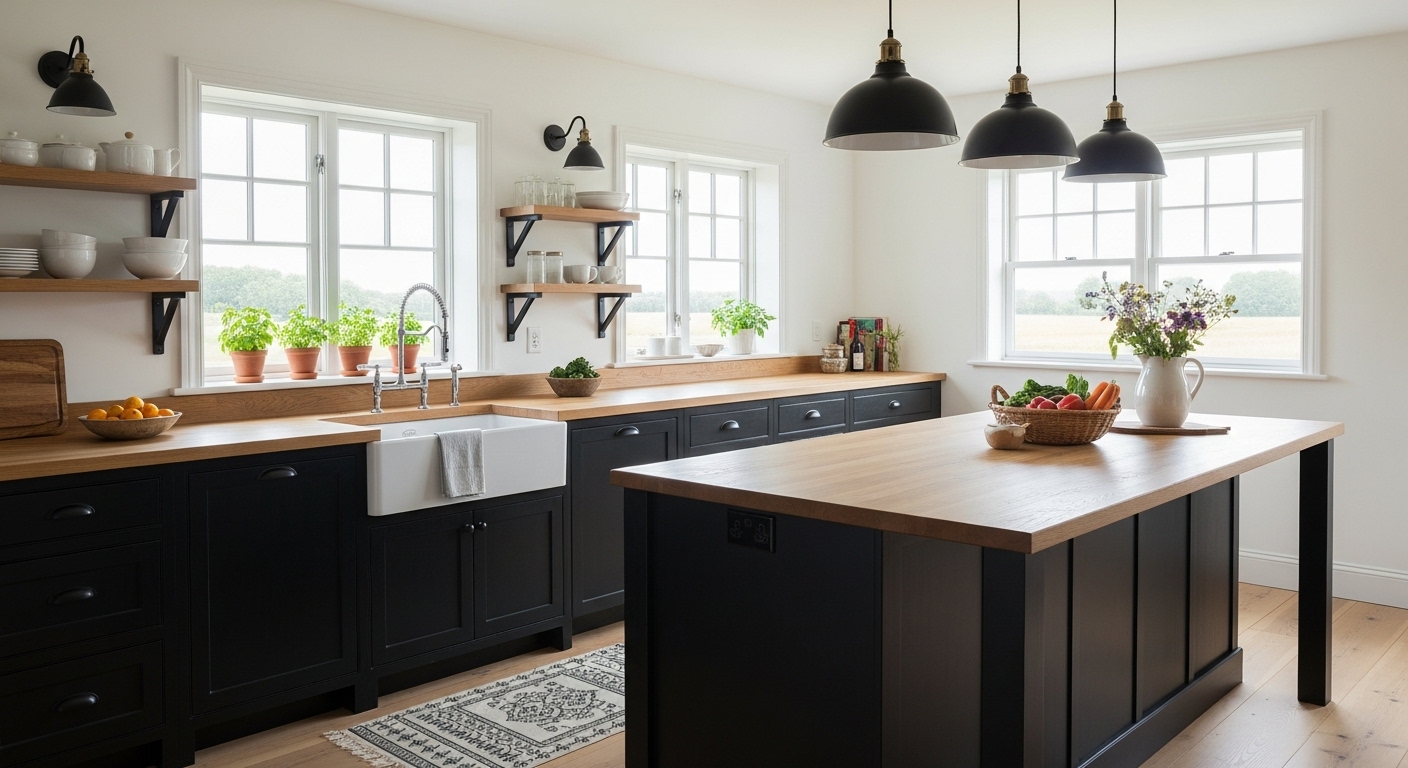 The most captivating farmhouse kitchens feel collected over time. Mixing painted and natural wood finishes creates depth and a story of evolution. Visualize white uppers with walnut lowers, hardware blending brass and matte black, and open shelving in reclaimed pine. Every contrast feels deliberate yet harmonious.