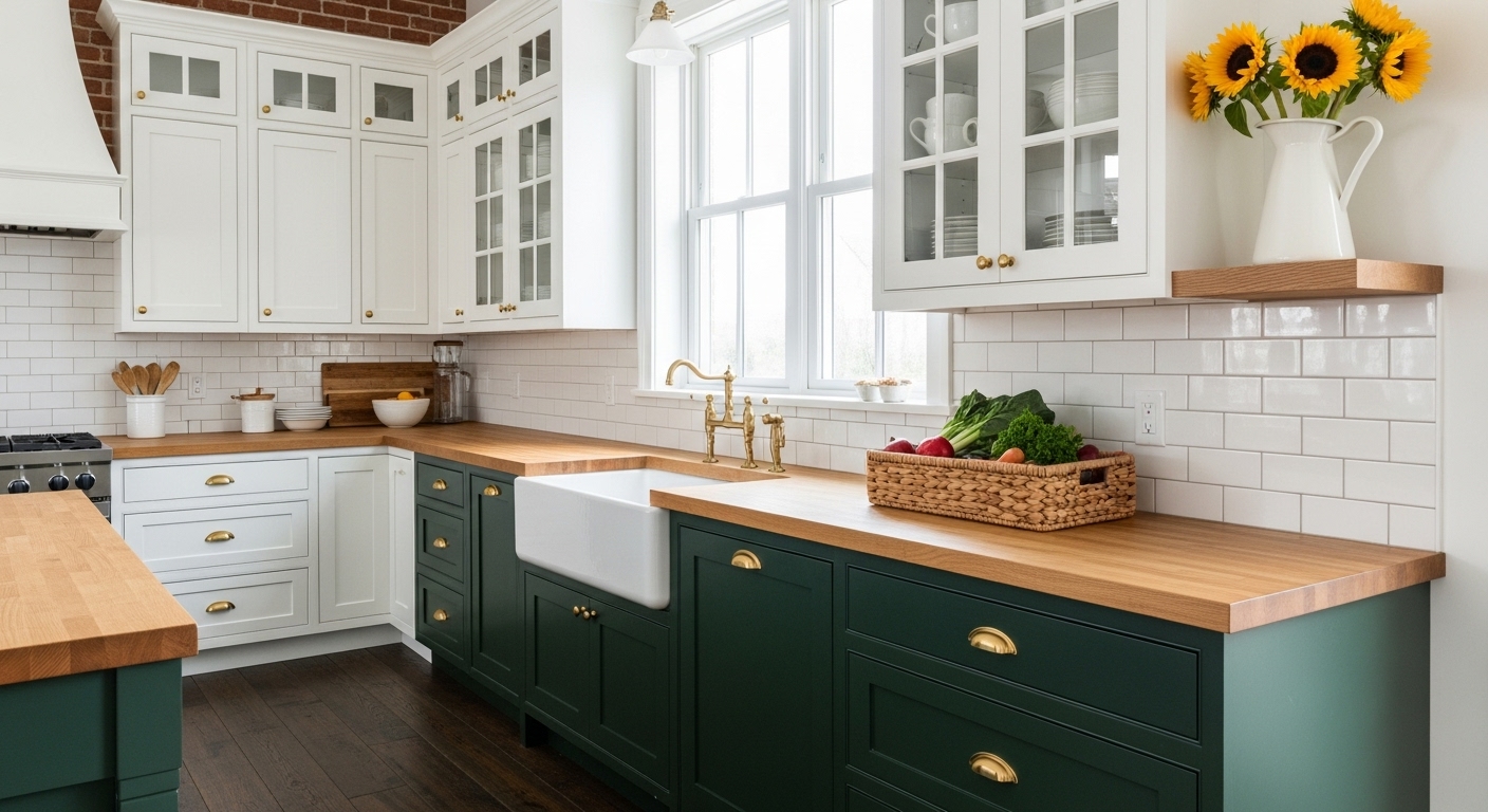 For farmhouse charm with a modern edge, go two-tone. This design pairs light upper cabinets with darker lower ones, grounding the space while maintaining an open feel. Think crisp white uppers contrasted with deep forest-green bases, tied together with warm brass pulls. The look feels structured but not stiff—a blend of tradition and trend.