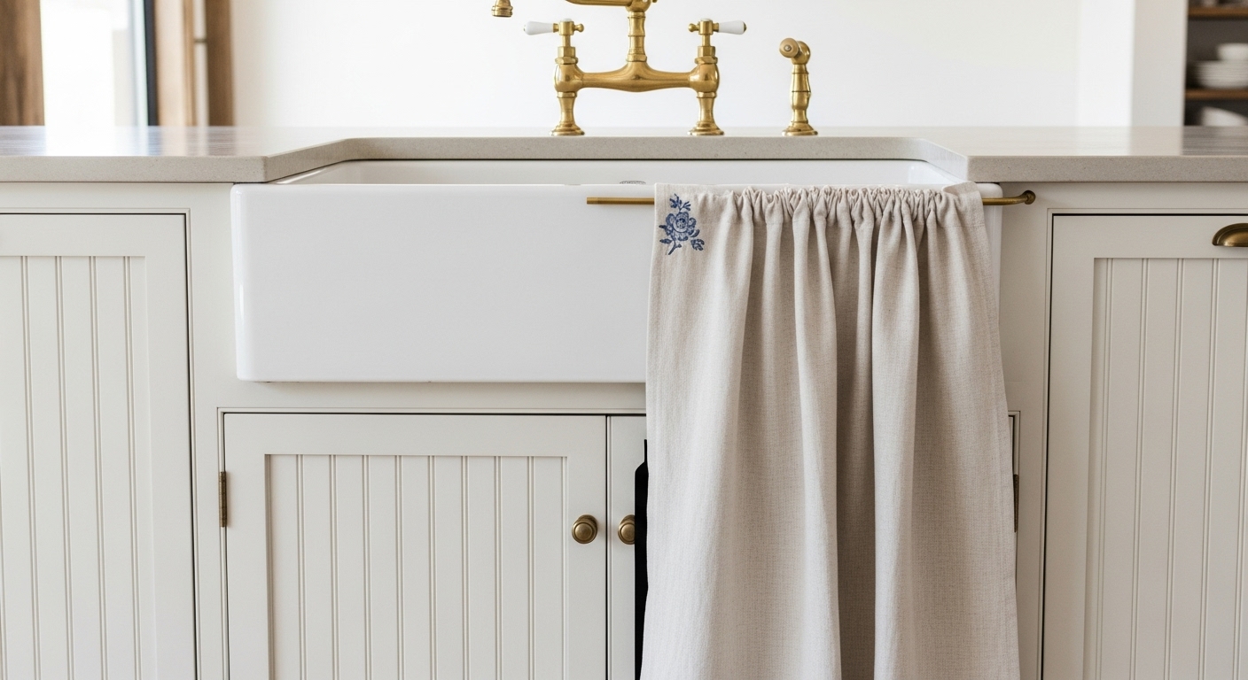 The farmhouse sink cabinet anchors the kitchen both visually and emotionally. Wide, deep, and durable, it’s as practical as it is iconic. Think a crisp white fireclay sink framed by beadboard cabinetry, with brass fixtures and a linen skirt for old-world charm. The sink’s generous proportions make washing up feel like a meditative act.