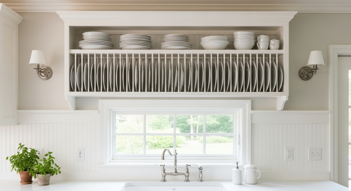 Built-in plate racks recall kitchens from another era—functional, graceful, and personal. They invite storytelling through display. Imagine neatly arranged stoneware plates on open wooden slats above the sink, framed by cabinetry painted in soft gray.