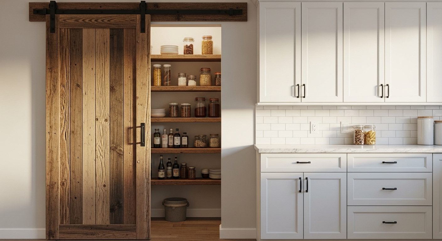 The sliding barn door isn’t just trendy—it’s timeless. It hides clutter while adding sculptural movement. Envision a reclaimed wood door on a black steel track, revealing shelves stocked with mason jars and woven baskets. It’s practical farmhouse elegance at its finest.