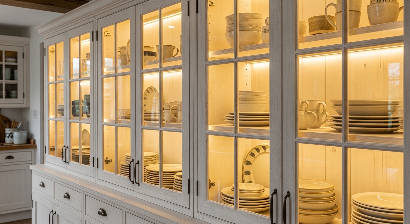 Glass-front cabinets give you the charm of open shelving with the practicality of closed storage. They make your kitchen feel brighter and more spacious while showcasing curated dishware or collectibles. Visualize tall cabinets with frosted glass panes, framed in warm cream wood. Behind them, neatly arranged bowls, mugs, and woven baskets glow softly under interior lighting.