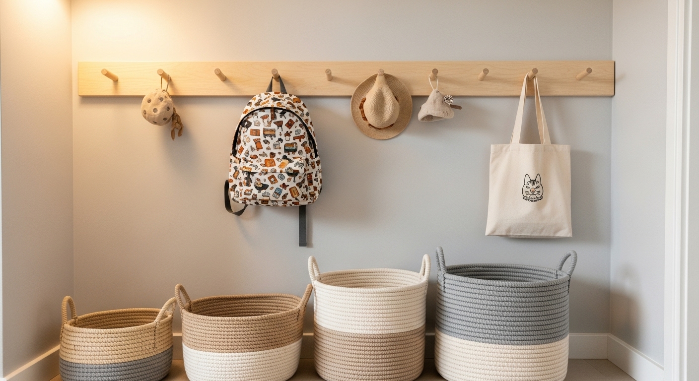 A wooden peg rail or minimalist metal rack helps children learn responsibility and maintain order. Combine with baskets below for shoes or accessories.