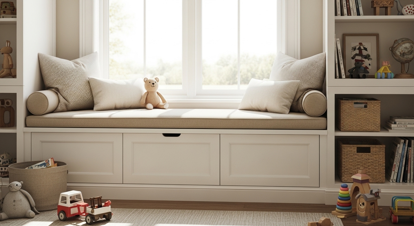 Picture a soft-cushioned bench beneath a sunny window, framed by bookshelves. Underneath, spacious drawers hold toys, stuffed animals, or blankets. Above, a few minimal floating shelves display storybooks and favorite keepsakes.