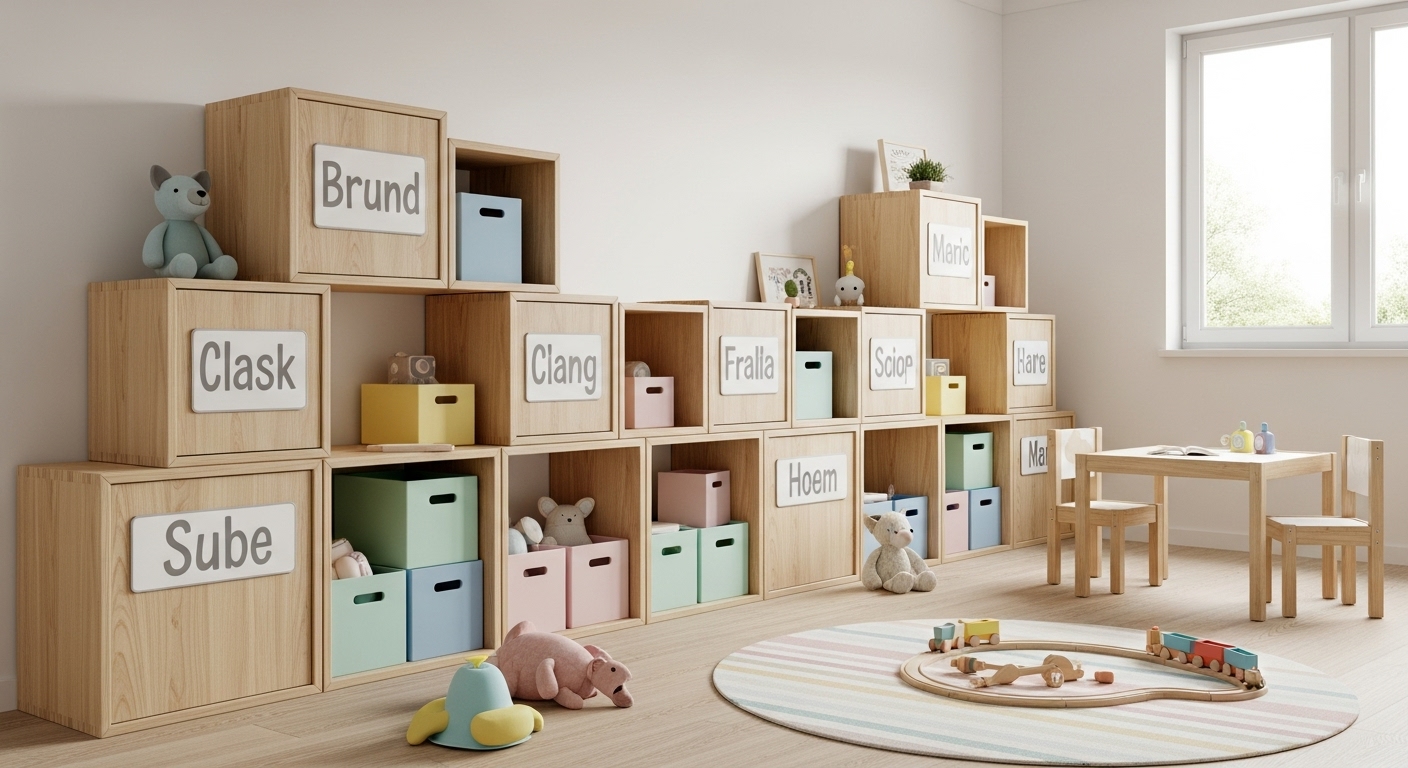 Envision a modular cube wall with bins in natural wood and white matte finishes. Some cubes hold books; others feature baskets for crafts and soft toys. The open design keeps everything within sight, minimizing visual clutter.