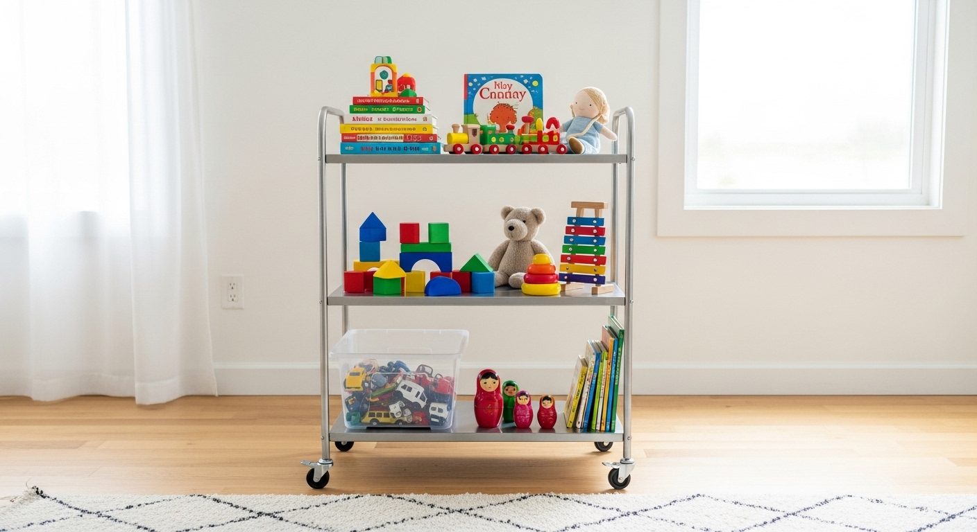 Imagine a slim, three-tier cart in white or powder blue filled with art supplies, LEGO bricks, or craft materials. When playtime’s over, it glides neatly back into a corner or closet.