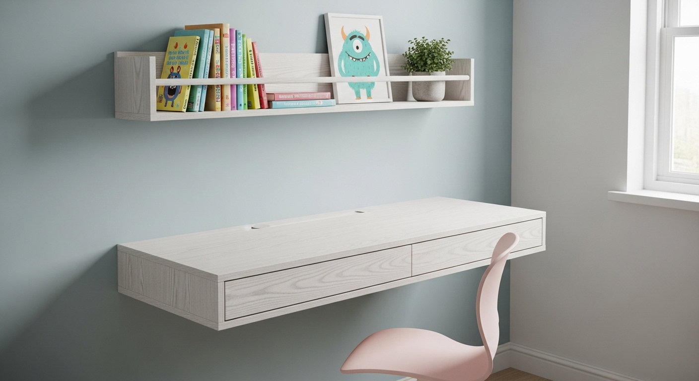 Picture a clean, wall-mounted desk with a small drawer or flip-up compartment to store notebooks and pencils. A floating shelf above completes the workspace, keeping it neat and inspiring.