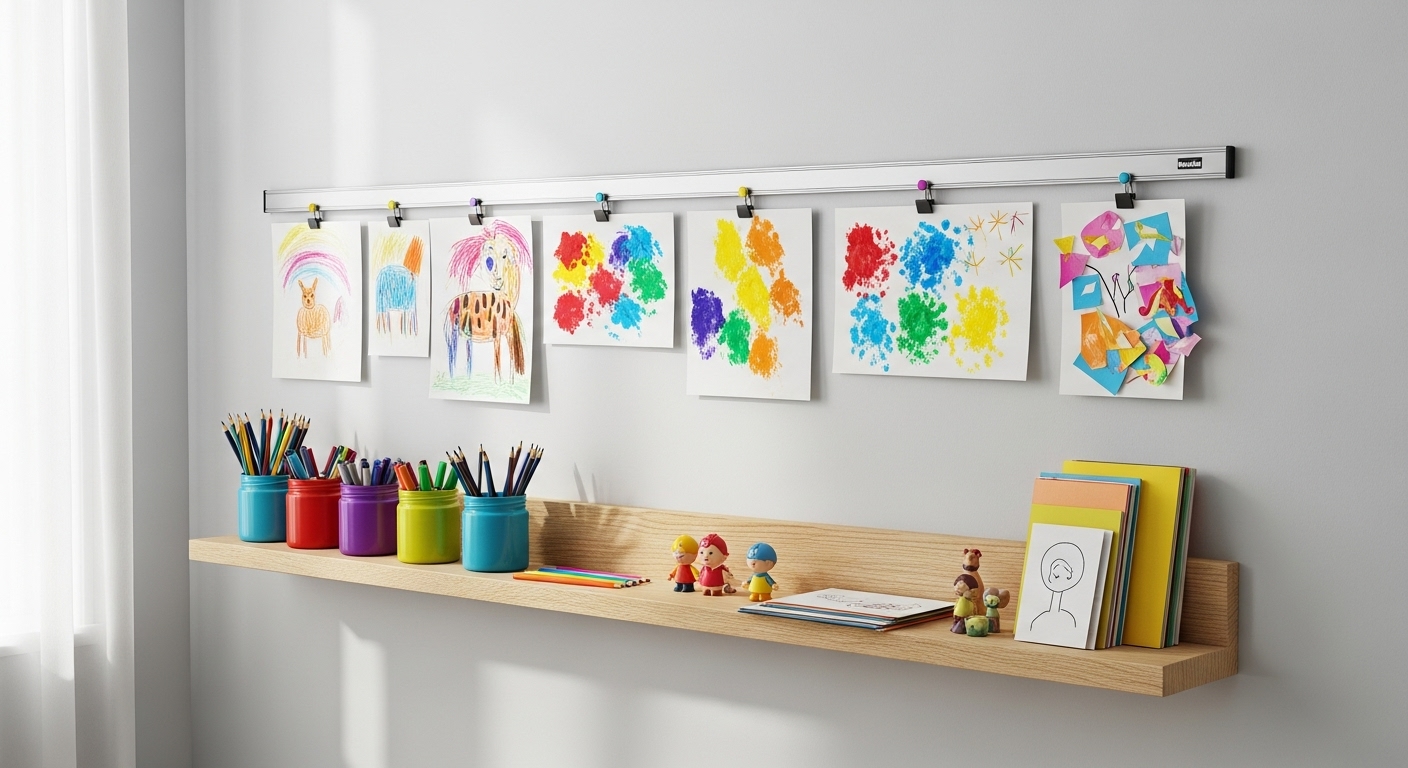 Showcasing your child’s creativity doesn’t have to create clutter. Install a magnetic or clip-on art rail above a slim shelf. The top holds framed drawings or photos, while the shelf below can store art supplies in small jars or bins.