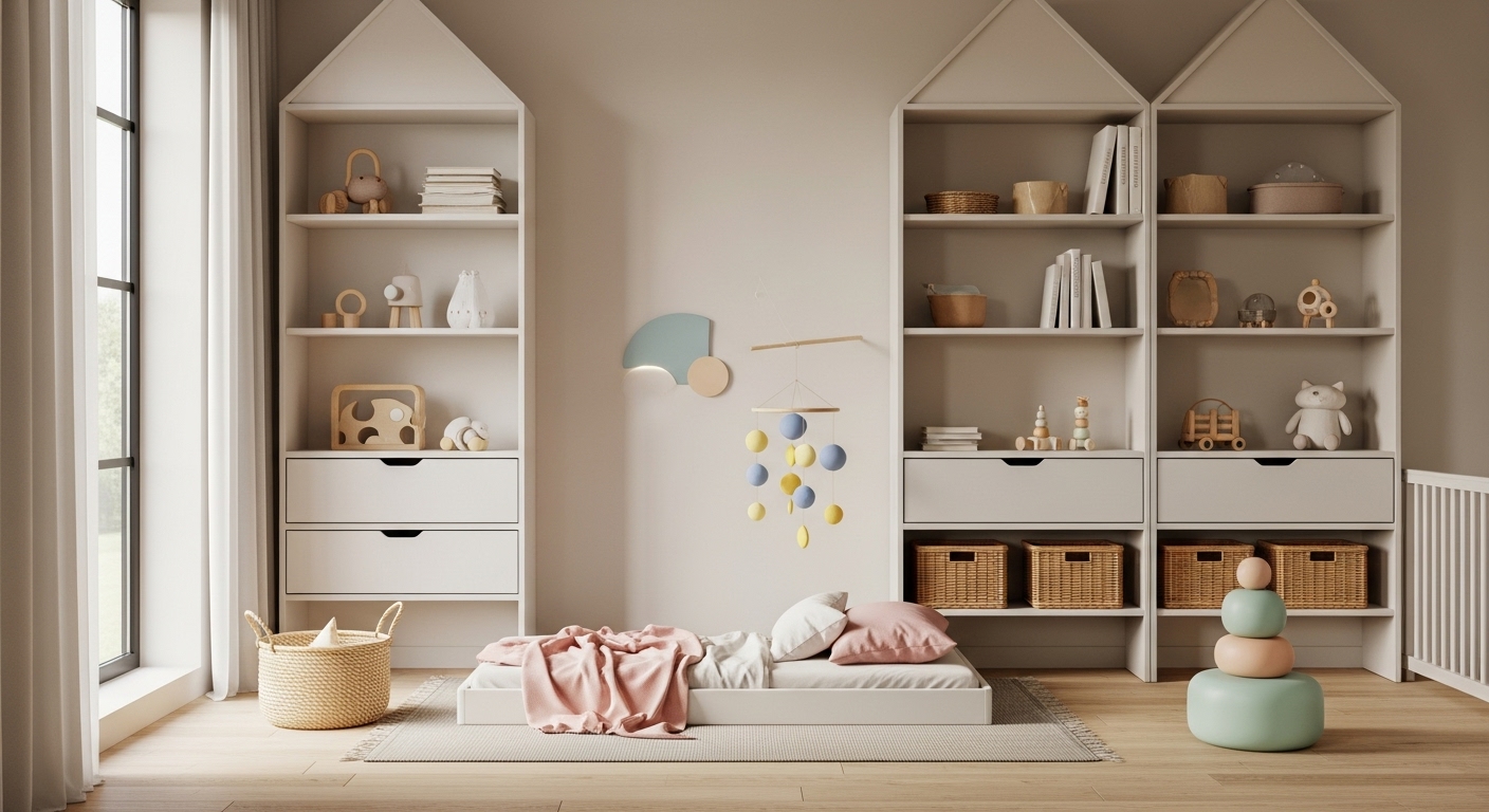 Choose shelves in birch or beech for a Scandinavian touch. Keep baskets neutral — canvas, wicker, or soft felt — for texture without chaos. Rotate toys regularly to keep things fresh and engaging.