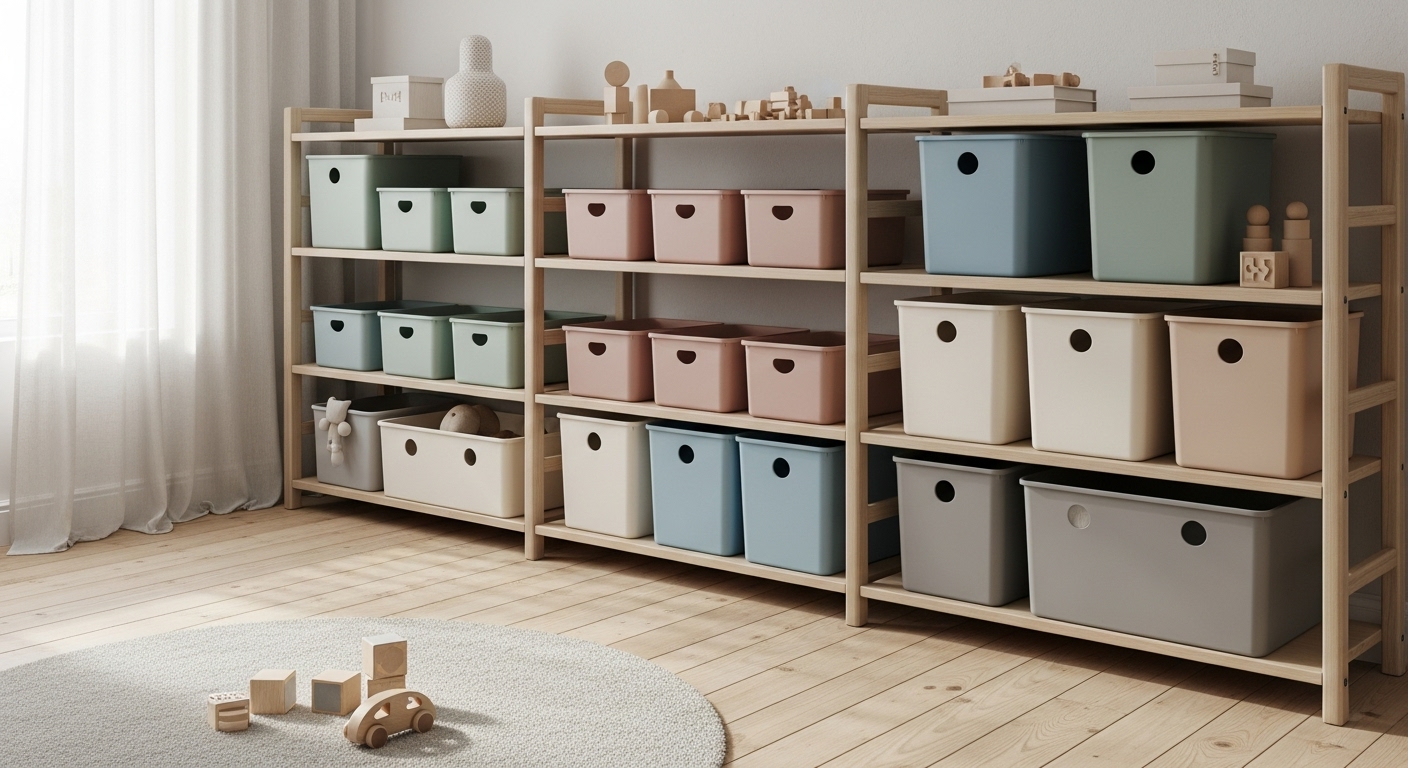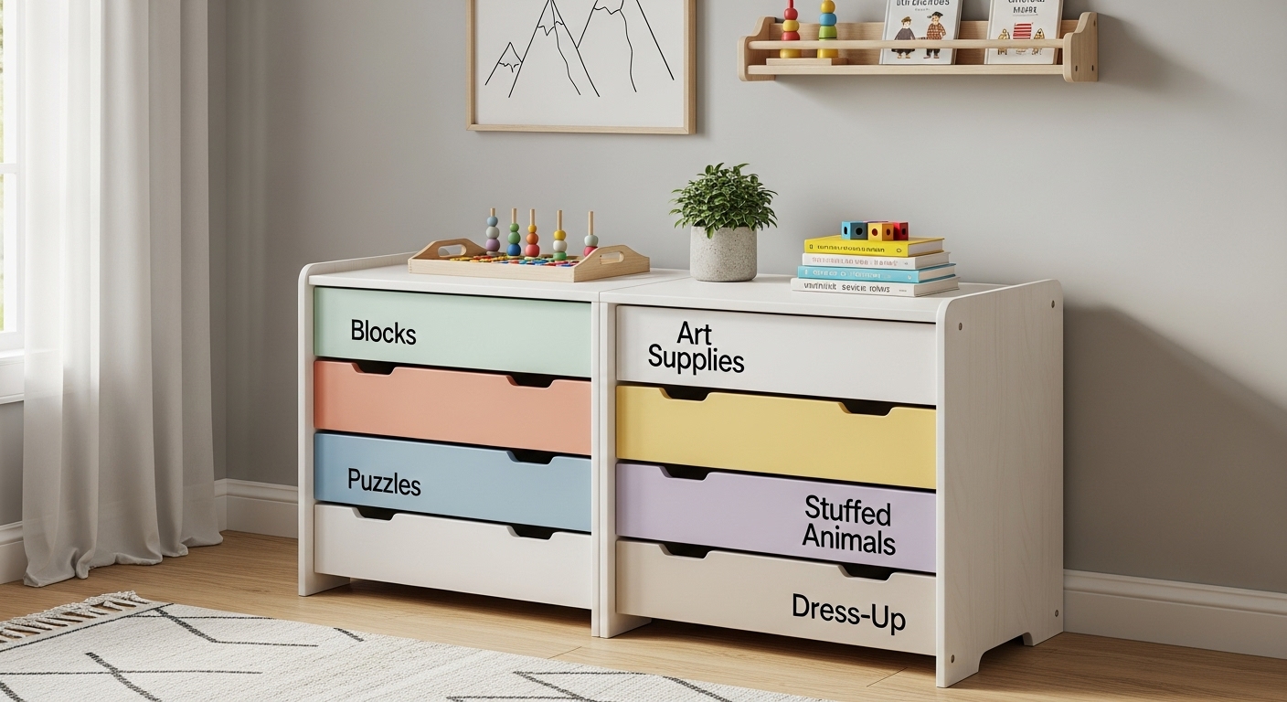 Color is a subtle organizing tool. Assign each category of toys or supplies a consistent shade of basket or bin — blue for books, beige for building blocks, green for art supplies. This creates a calm visual rhythm that simplifies tidying and enhances the aesthetic balance of the room.