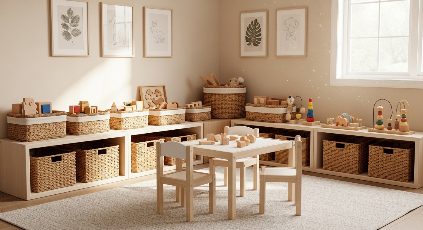Stick to neutral materials — rattan, seagrass, or cotton rope. For color harmony, use linen liners in beige or soft green. They’re beautiful, functional, and easy for little hands to manage.