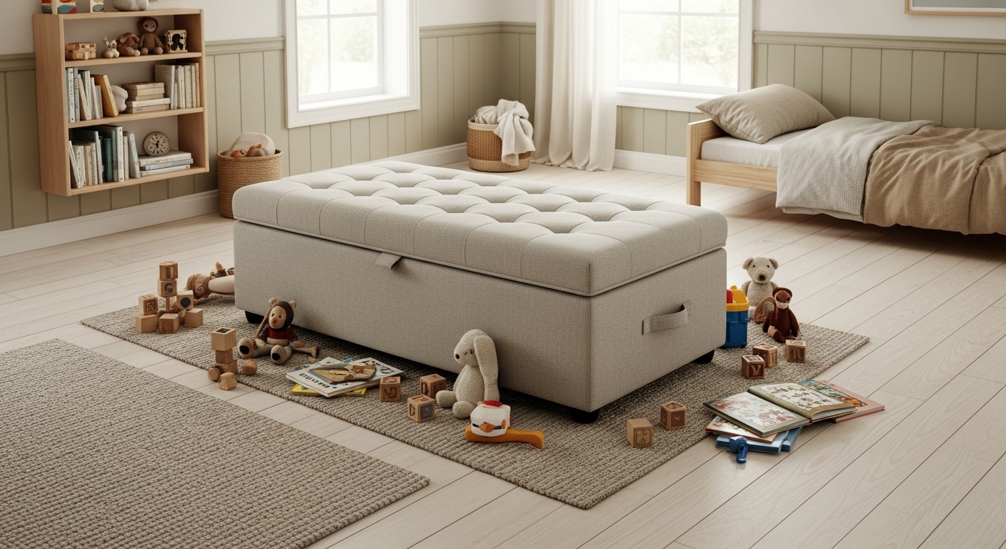 Choose soft upholstery in neutral fabrics like linen or boucle for a refined, kid-safe finish. This approach keeps toys accessible yet invisible.