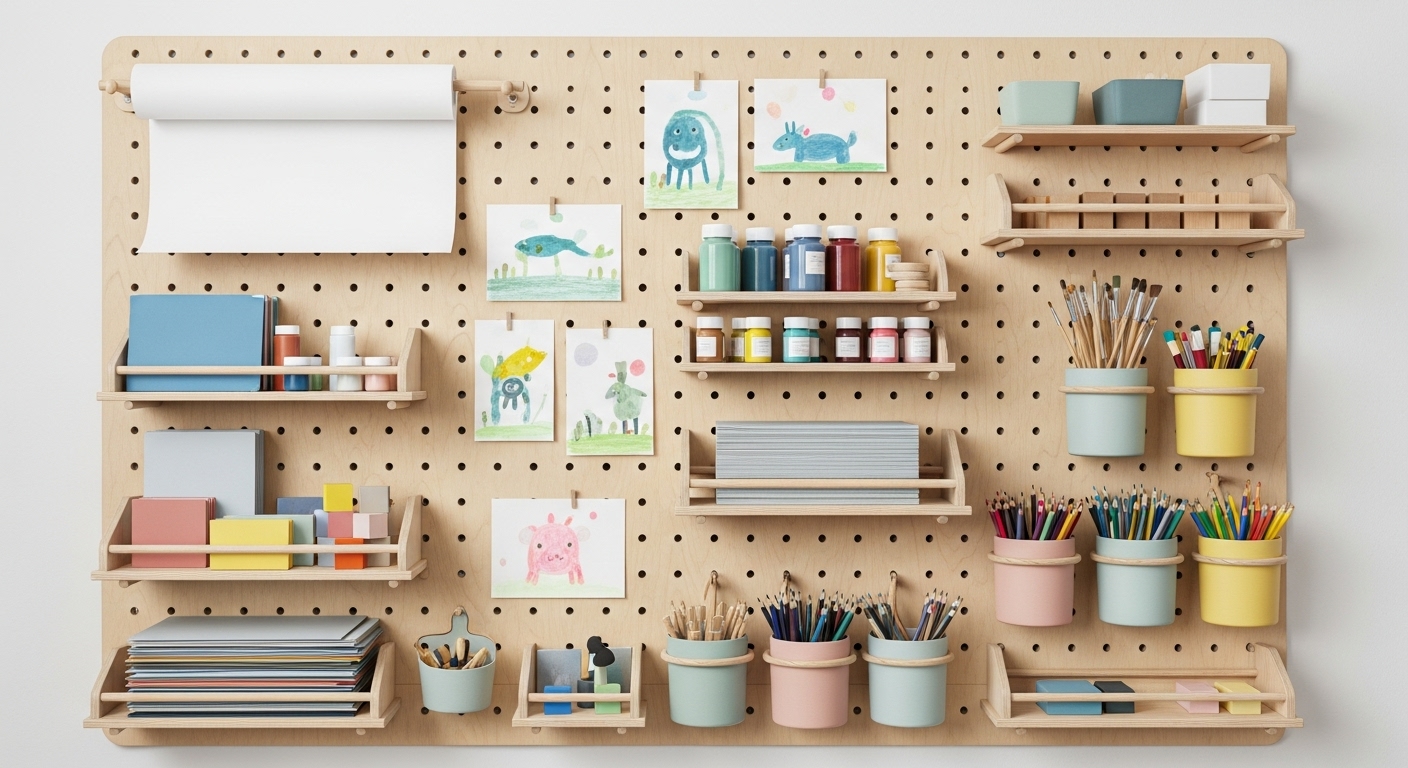 If you want a system that evolves with your child, wall-mounted pegboards are the ultimate flexible solution. A pegboard painted in soft gray or blush can hold shelves, hooks, or baskets that move as your child grows. Hang craft supplies, display art, or store small toys in baskets.