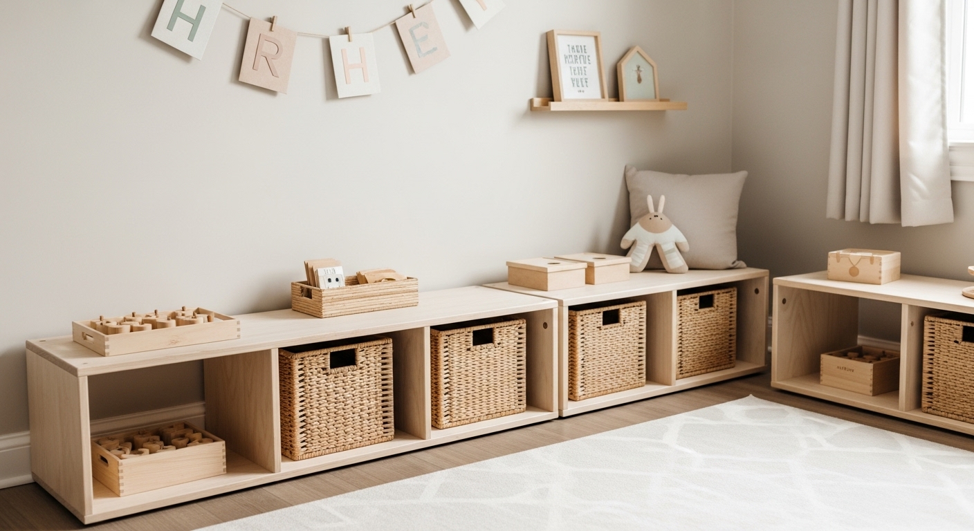 Imagine a row of sleek, natural-wood shelves aligned at your child’s height. A few carefully chosen baskets hold building blocks, puzzles, or art supplies. Each item has a clear “home,” reducing clutter and simplifying playtime cleanup.