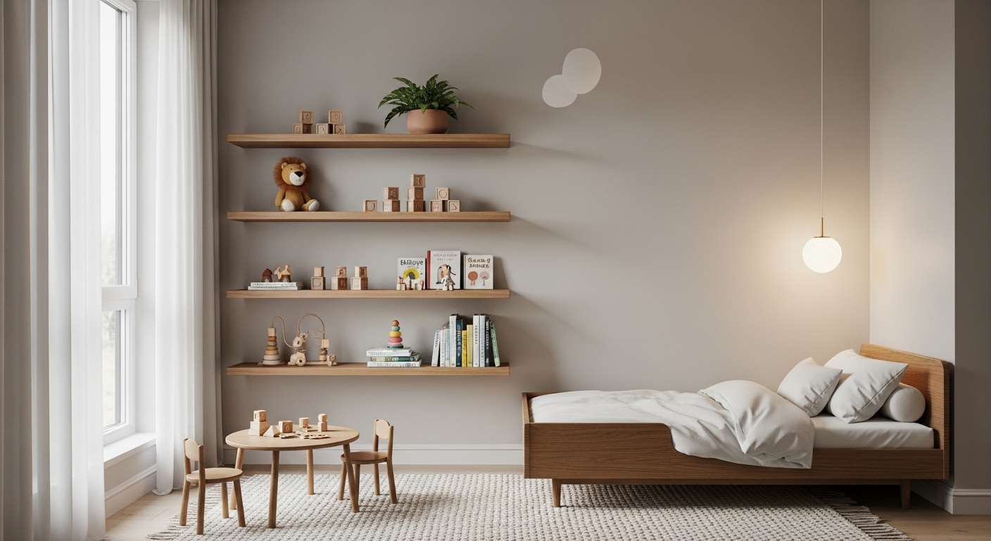 Picture a set of white or oak shelves staggered along one wall. On them — neatly stacked books, wooden toys, and framed art prints. The look feels airy, curated, and calm.