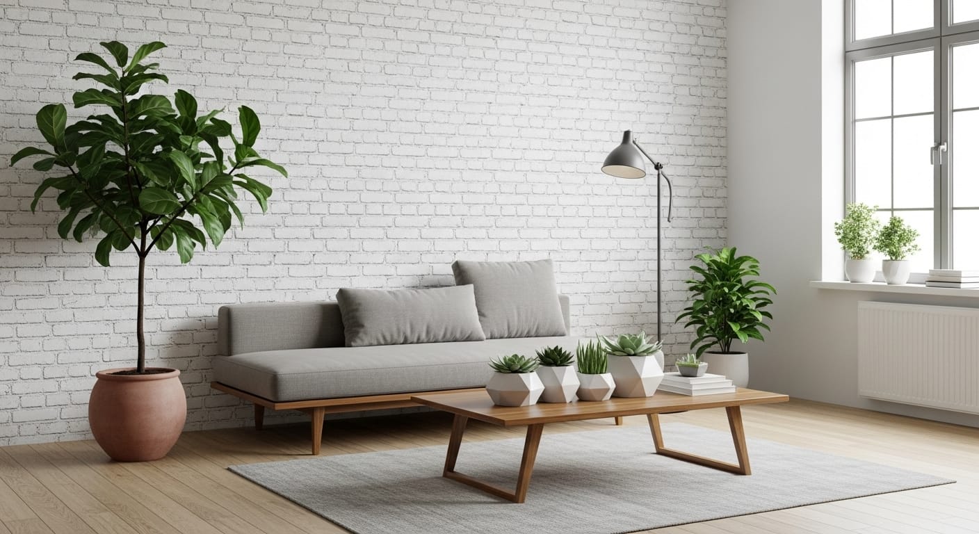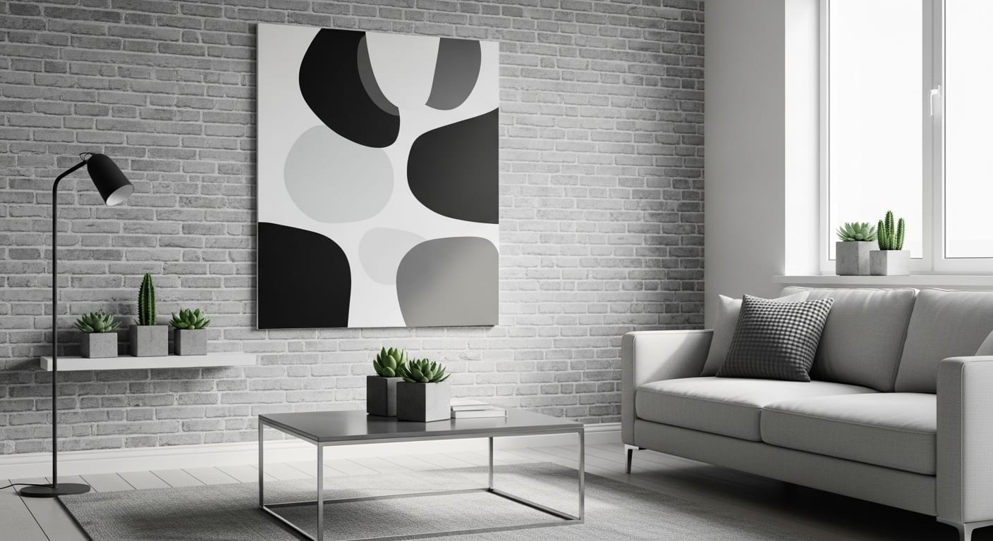 Imagine a minimalist living area with a pale gray brick backdrop, steel furniture, and clean architectural lines. The cool tones complement both monochrome palettes and bursts of color like mustard or navy.
