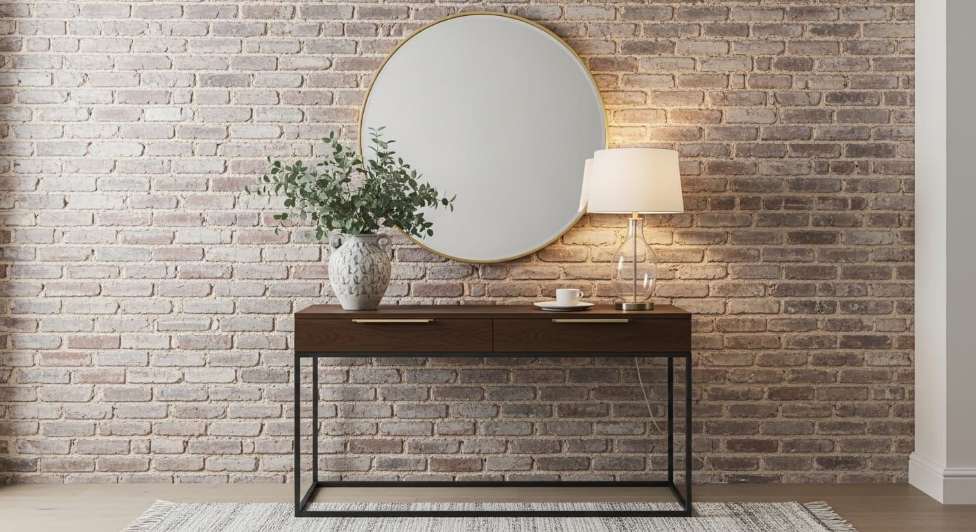 For added function, install hooks or a console table with metal legs for a modern touch. Pair the rough brick with smooth surfaces like glass or polished wood for visual balance.