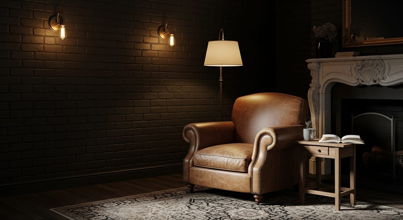 Imagine a lounge with matte black bricks illuminated by warm sconces — a balance of shadow and light that creates an undeniable atmosphere. This look pairs well with leather furniture, brass finishes, and low, ambient lighting.