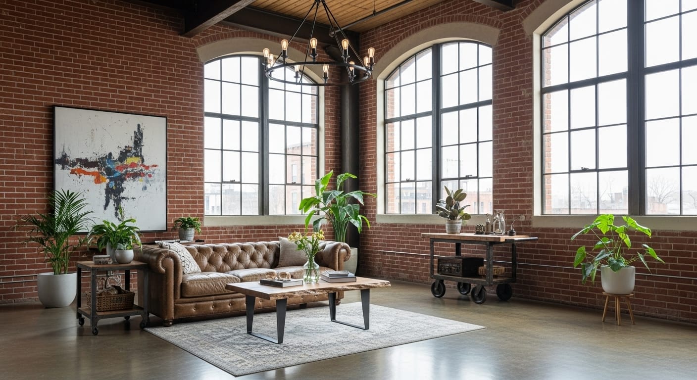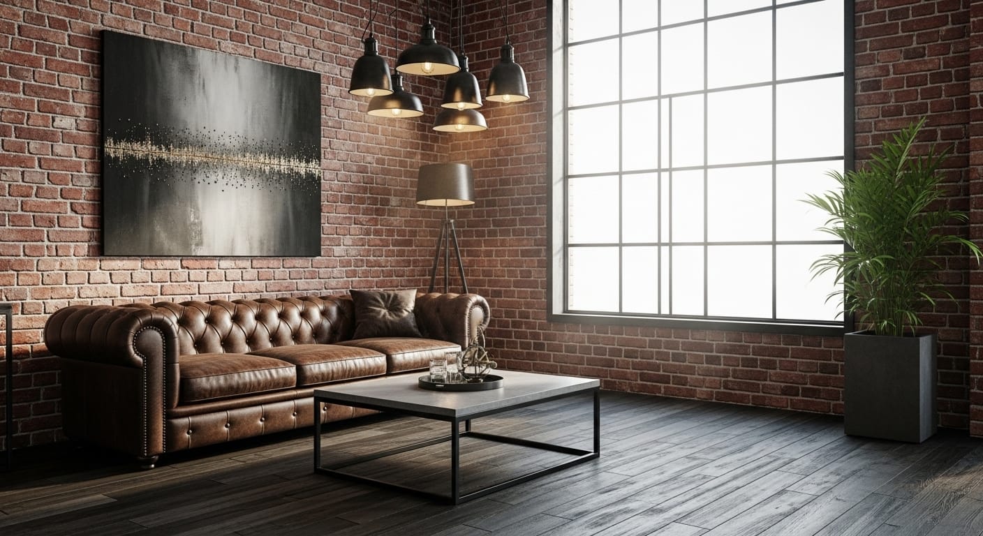 Envision a high-ceilinged loft with exposed ductwork, black steel beams, and a red brick wall stretching floor-to-ceiling. It’s minimal yet monumental, creating an authentic warehouse vibe.