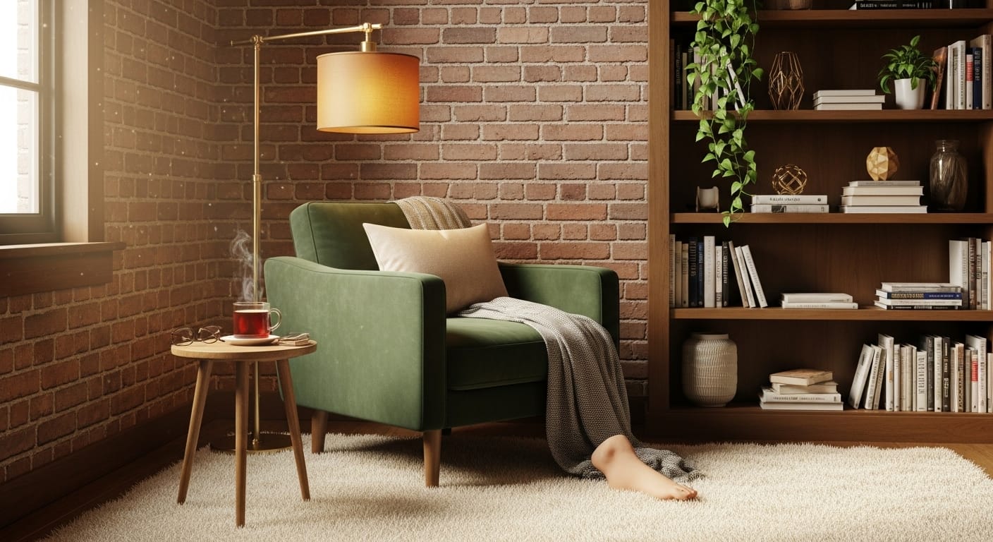 If you love cozy spaces, a brick reading nook is pure comfort. The texture adds intimacy, while the color introduces a grounding calm. Place a comfortable armchair against the wall with a small floor lamp and a floating shelf. Use warm-toned bricks to make the nook feel cocooned, or whitewashed brick for an airy reading retreat.