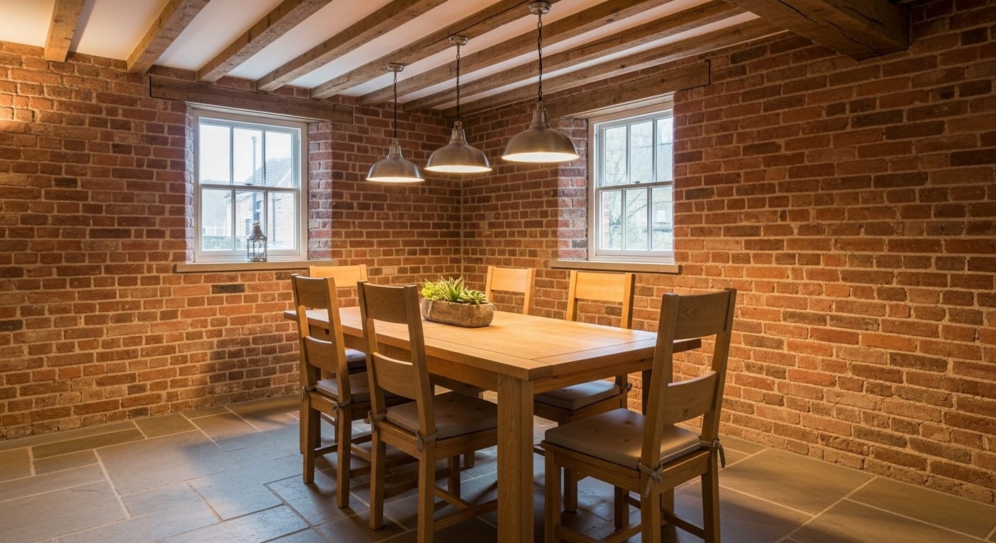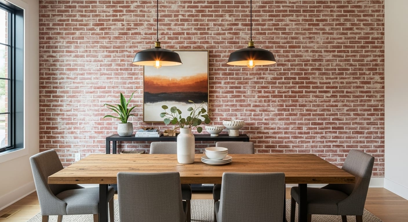 Imagine a long wooden table surrounded by mixed chairs, set against a backdrop of deep red or burnt orange brick. Add industrial pendant lights overhead and perhaps a gallery of framed photos or art.